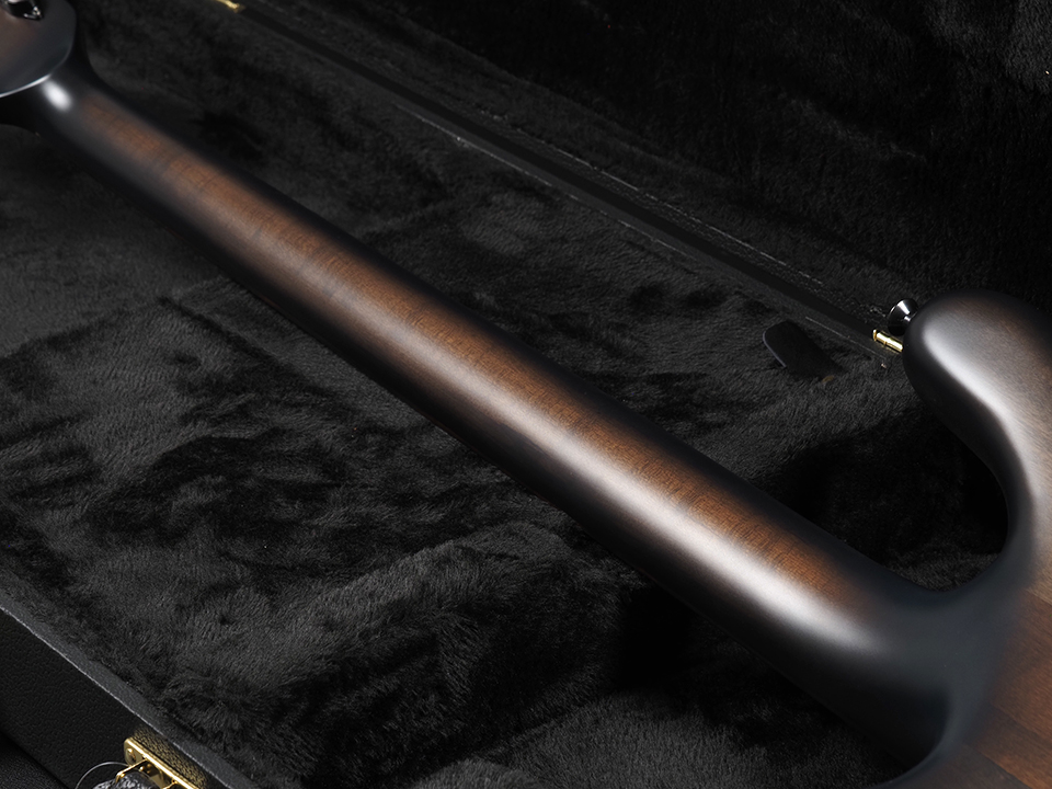 ネック材は3ピースのローステッドメイプルで、指板材はマッカーサーエボニーです。指板インレイにはアヴァロンによるクラウンインレイが施されています。