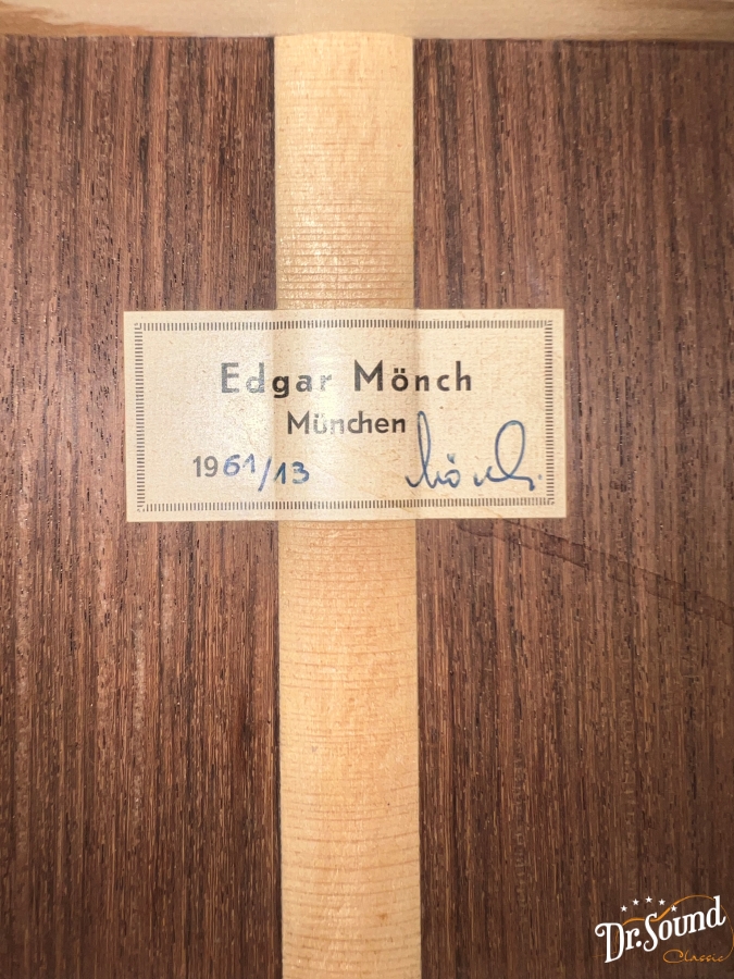 エドガー・メンヒ(1907-1977)は、ドイツのライプツィヒで生まれました。父はヴァイオリニスト、母はロシア人のピアニストという音楽の家系でした。第二次大戦中に、ポーランド人のヴァイオリン職人と出会い、ギター製作を教えてもらったことが製作家への道を歩むことになったきっかけと言われています。終戦後に工房を開き、短い期間ながらスペインの名工マルセロ・バルベロ1世(1904-1956)との交流によってギター製作を学び大きな影響を受けました。同郷の名工ヘルマン・ハウザー2世(1911-1988)と共同で製作していた時期もあります。