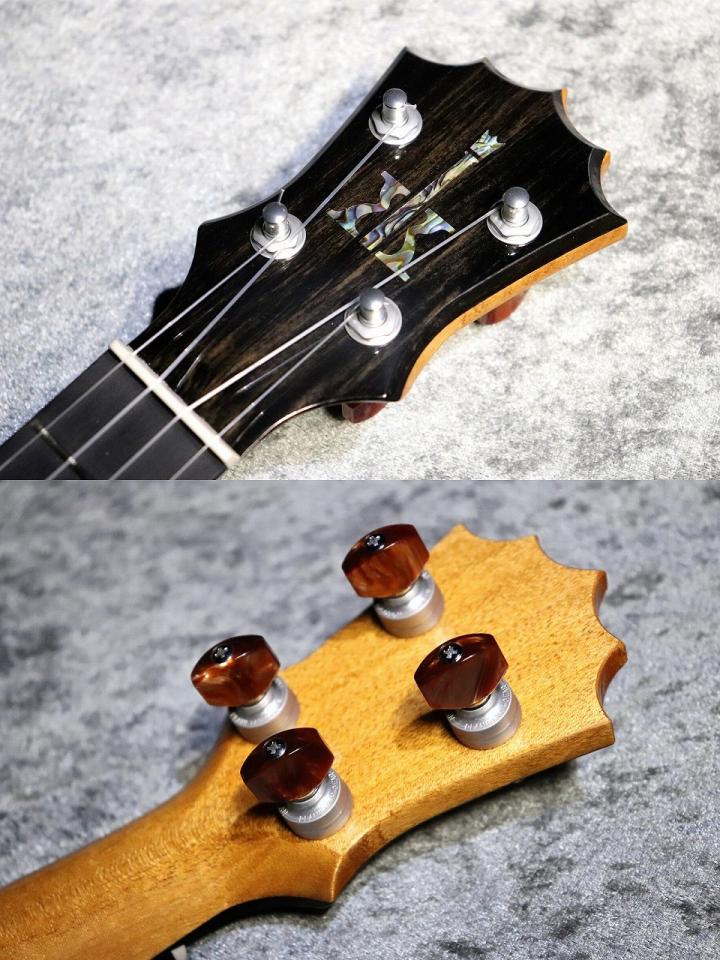 魅力的な杢目を持つハワイアンコアボディ、ネックはマホガニーで芯がありつつも甘い色気のあるサウンドを持ちます。指板とブリッジはエボニー、ナットとサドルはタスクを採用。より輪郭のあるサウンドを作り出します。