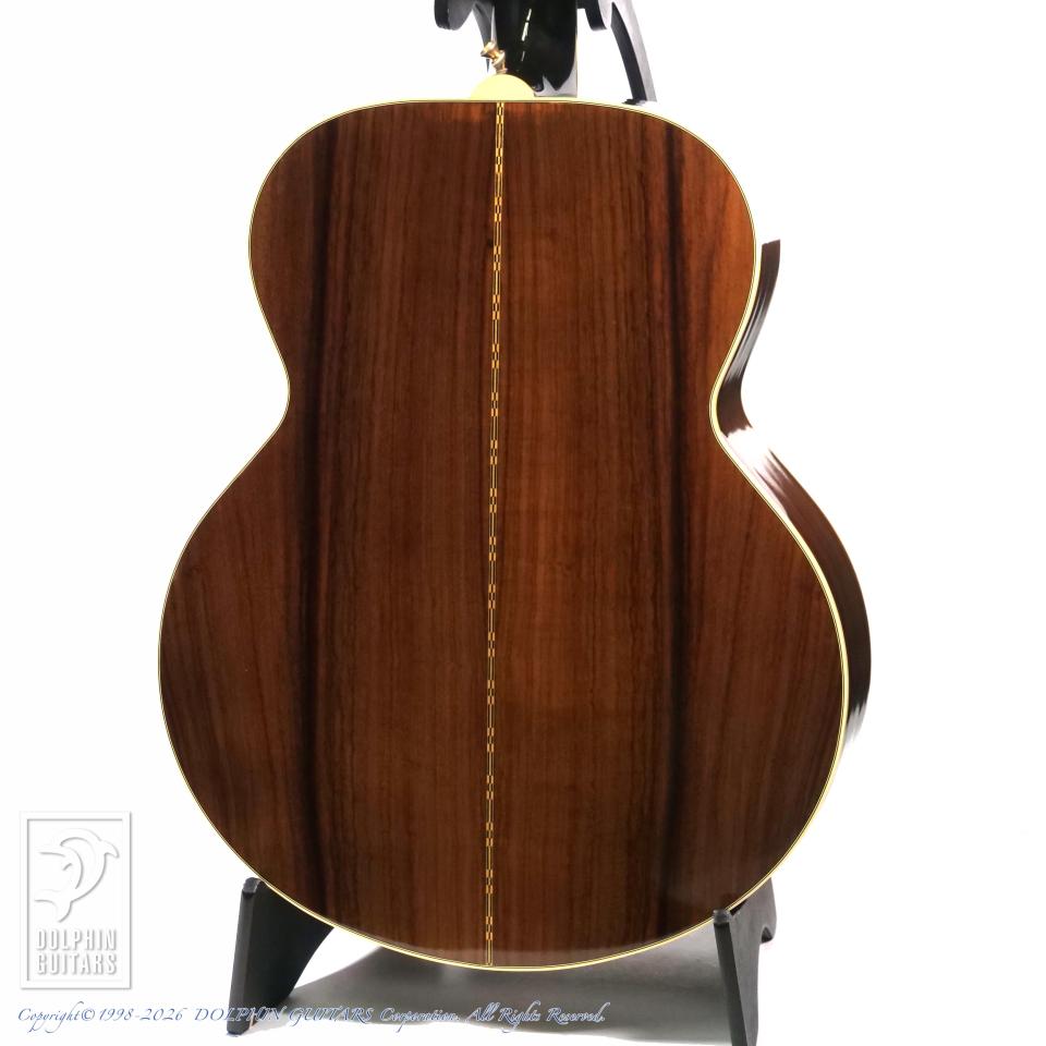 通常のJ-200といえばメイプル材を用いた華やかで抜けの良いサウンドが定番ですが、本器最大の特徴はその名の通りローズウッド・サイド&バックを採用している点にあります。これにより、J-200ならではの豊かな音量感ときらびやかさを保ちながらも、より深みのある低音、厚みのある中域、そして奥行きに富んだ響きを獲得。一般的なJ-200とはひと味異なる、重厚かつ艶やかなサウンドキャラクターをお楽しみいただけます。抱えて弾くと"ドウーン"と背中まで響くサウンドはプレイヤーをあっという間に惹き込んでしまうでしょう。