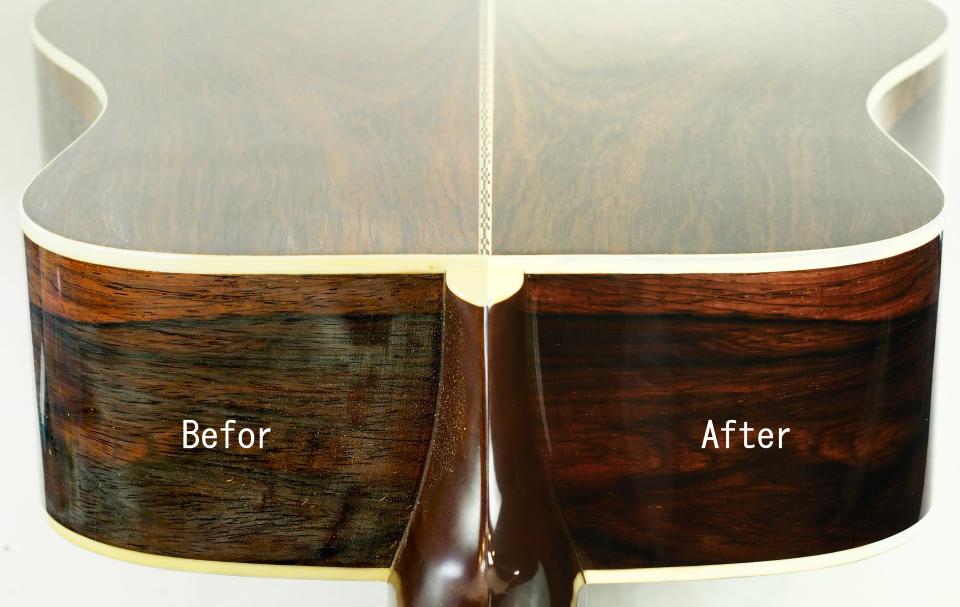 白濁していたボディを再塗装して、美しいハカランダの木目を楽しめるように仕上げました。