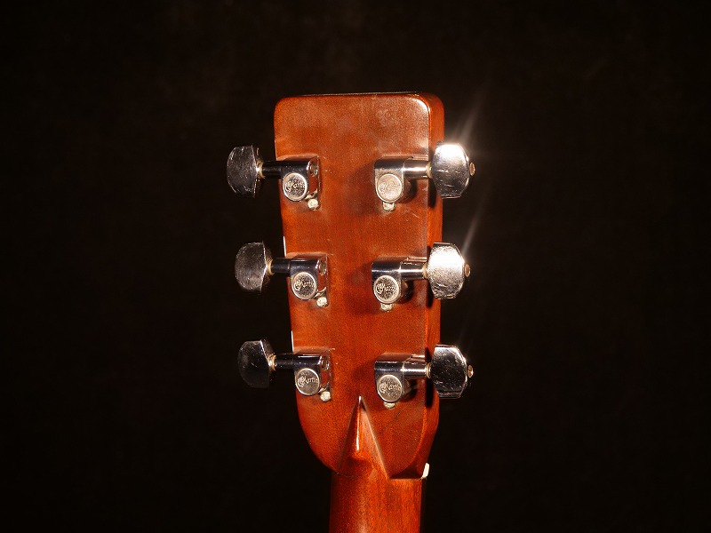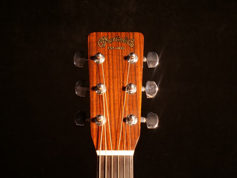マホガニーSQネック、エボニー指板&ブリッジ、Martin刻印入りシャーラーペグ、鼈甲柄ピックガード、ヘリンボーン・バインディング、ノーマルシフトのスキャロップドXブレーシング、約645mmスケール。ナット幅は約43mmでやや厚めのソフトVシェイプ型です。