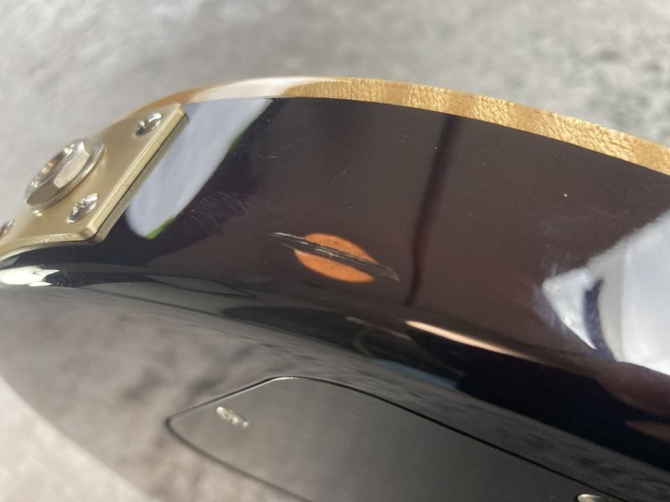 本機は特注により製作された限定モデルで、指板には希少なブラジリアンローズウッドを採用した貴重な1本です。トップには厳選されたメイプルを使用しており、太めの杢目が際立つワイルドなルックスが印象的です。ボディバックおよびネックにはマホガニーを使用しています。