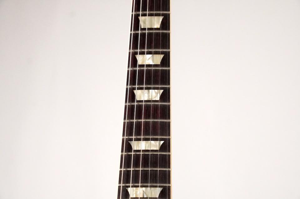 指板にはインディアンローズウッドを使用し、セルロースナイトレートのトラペゾイドインレイが施された、ヴィンテージライクなルックスも特徴です。