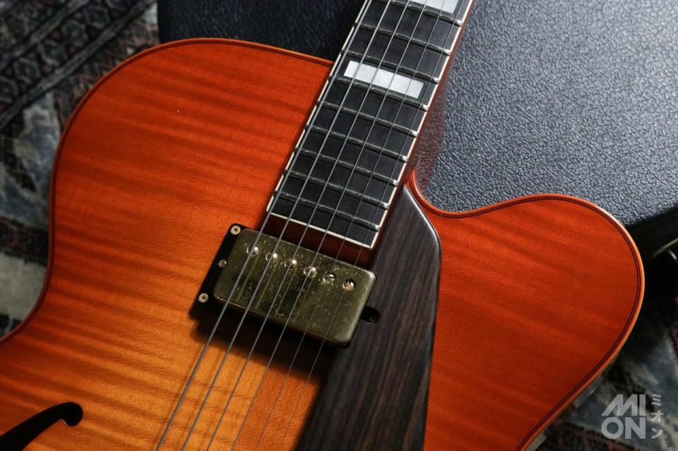 ウォームなサウンドを出すには単板よりも合板のほうが良いという考えであったため、豊かな木目の入ったフレームメイプルの合板をボディ材に使用し、ピックアップはトップに直に取り付けられています。テイルピースやピックガードはエボニーで、初めてのフルアコにぴったりなスペック。