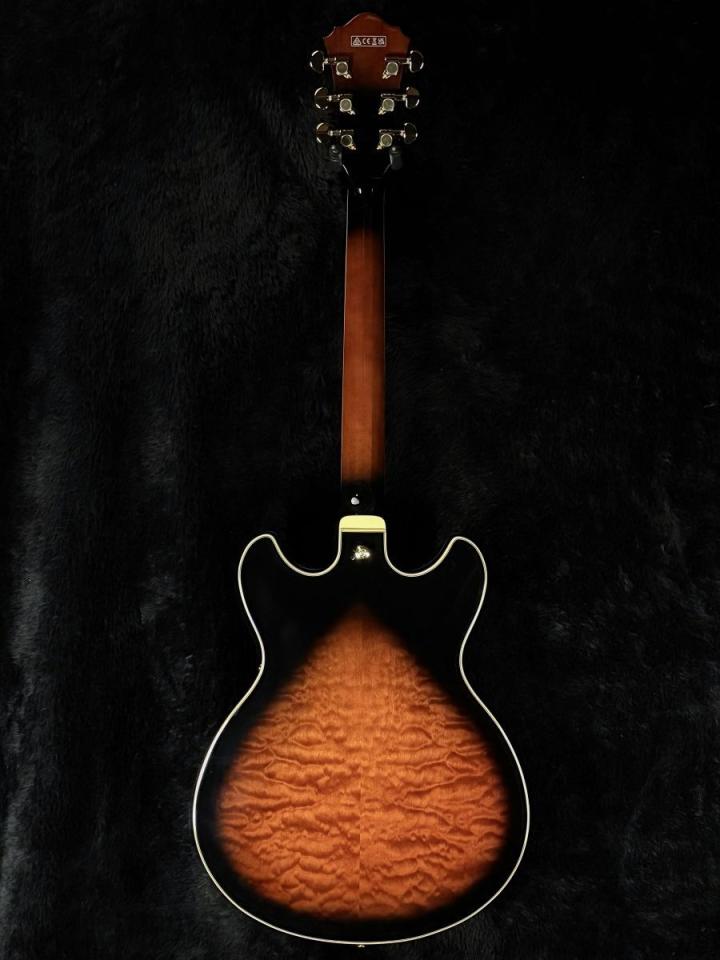 ES-335等の一般的なセミアコより若干小振りなボディデザインで抱えやすく、ハイポジションまでスムーズなフィンガリングが可能です。