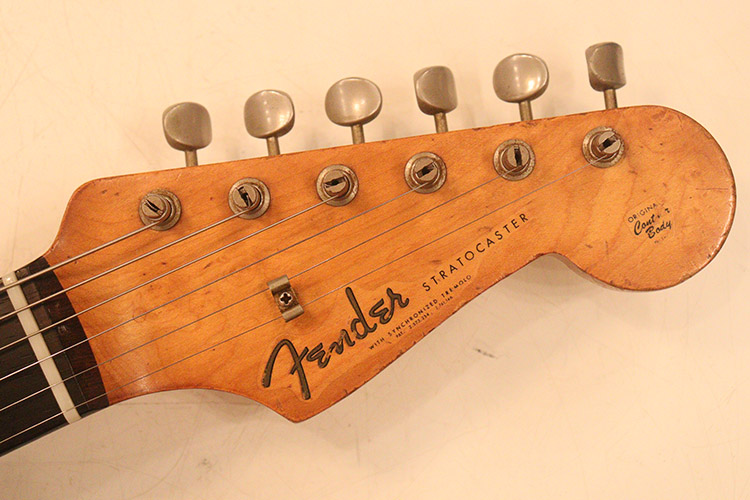 内容も、ピックアップはオリジナル・ブラックボビン、ポットデイトは62年初頭、他アッセンブリーもオリジナル、ピックガードはオリジナルのグリーンガード、その他のプラスティック・パーツもオリジナルで、ハードウェアはブリッジ・ハイト調整のスクリューとアームバーが後年の物に変更されている以外は、チューナー含めてオリジナルです