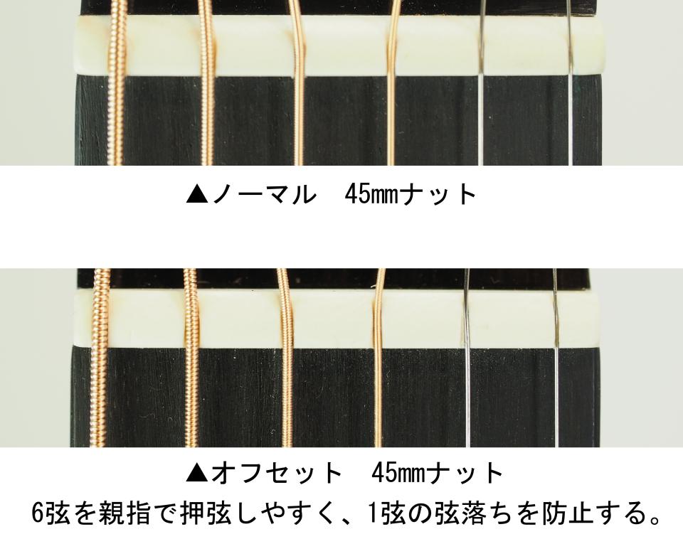 その一例として、6弦側にナットの溝をオフセットしたカスタムなども可能です。(画像参照)