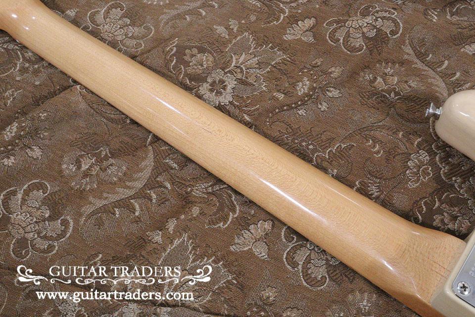The neck is a one-piece maple neck with a large head in reverse, and the "Fender" head logo is a transition type.