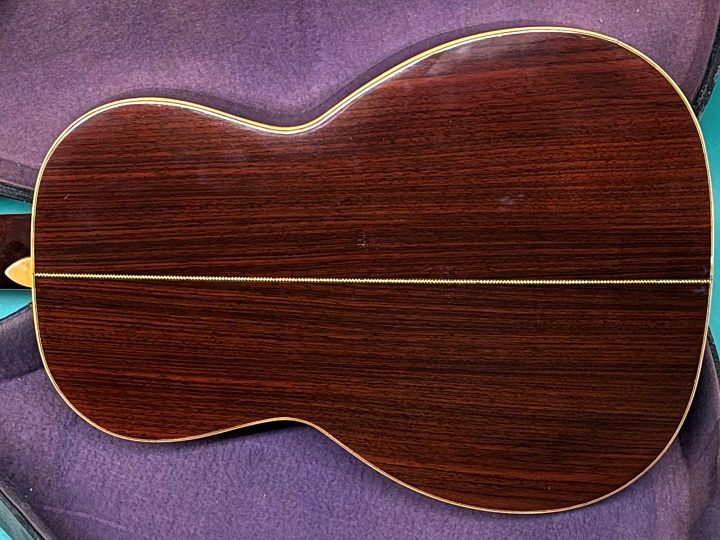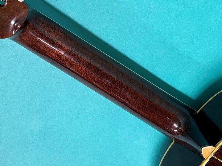 サイド、バックはブラジリアンローズウッドだと思いますが、サイドは板目のあきらかなブラジリアンですが、バックはインディアンローズにも見える材です。当時はマーチン以外はローズウッドはブラジリアンと他のローズウッドと区別しないで使っていたらしく、このような微妙な材も多く見受けられますね。内部を見ると製材時のノコギリの跡が見えてて、時代を感じます。