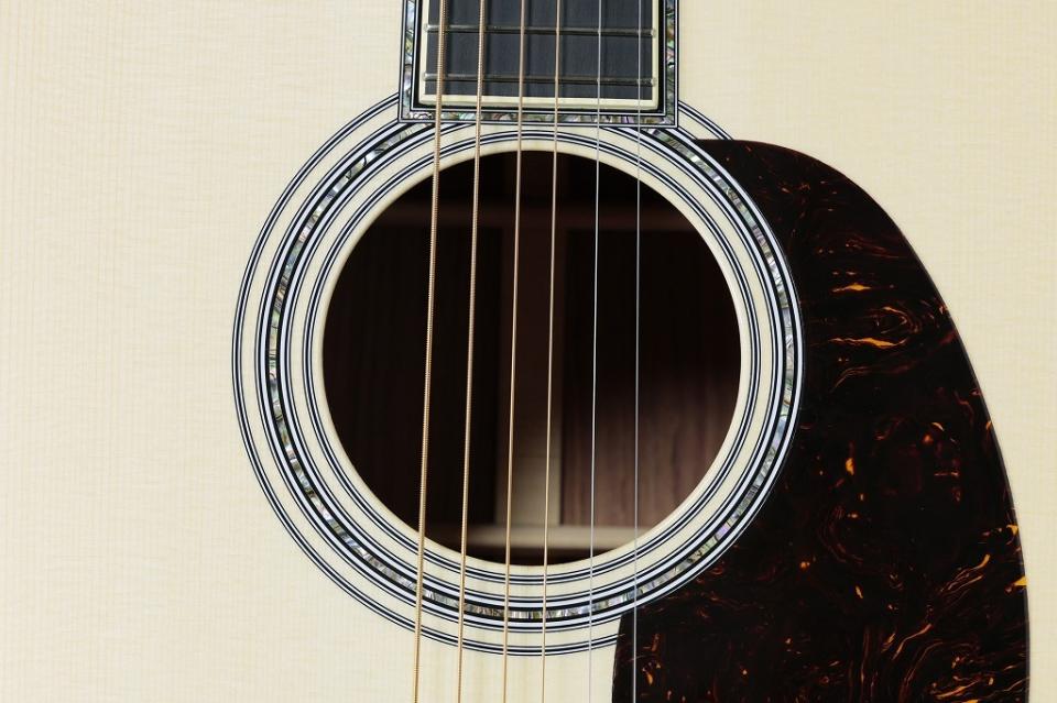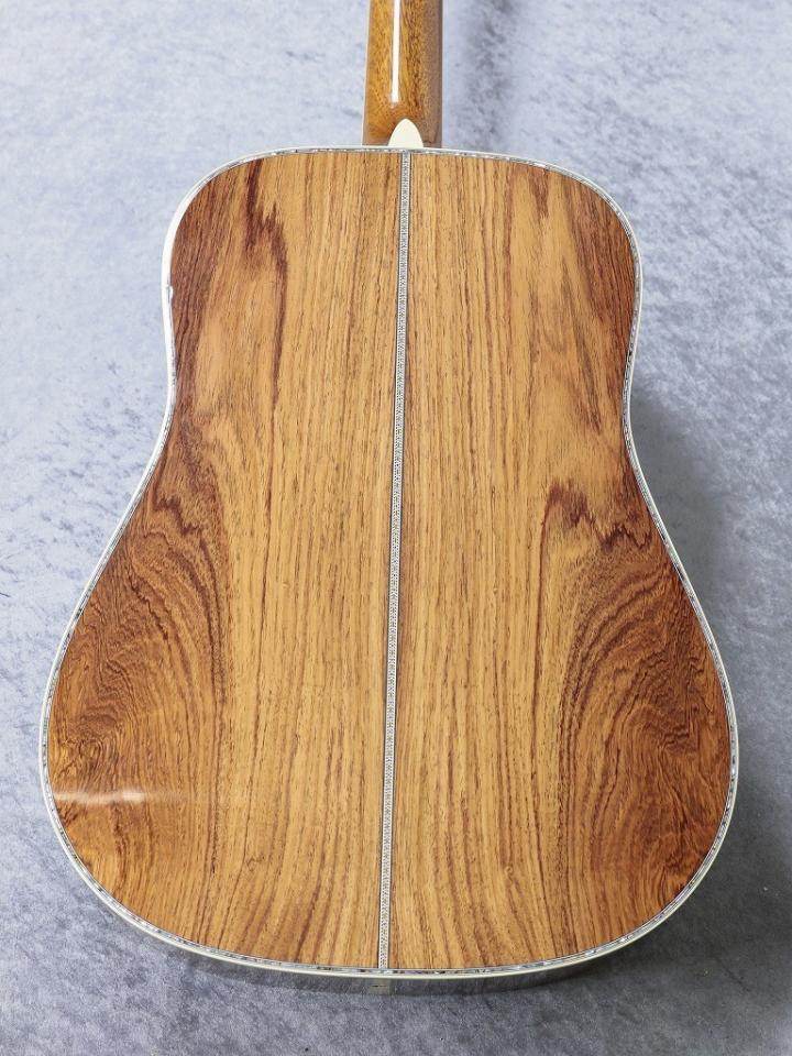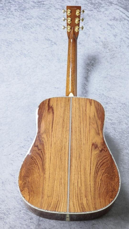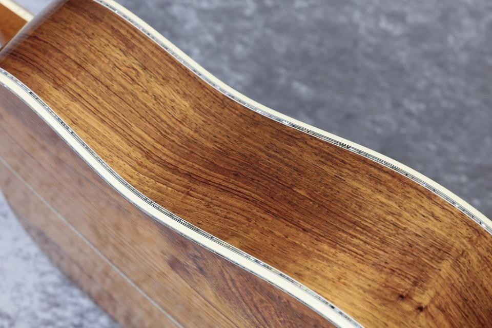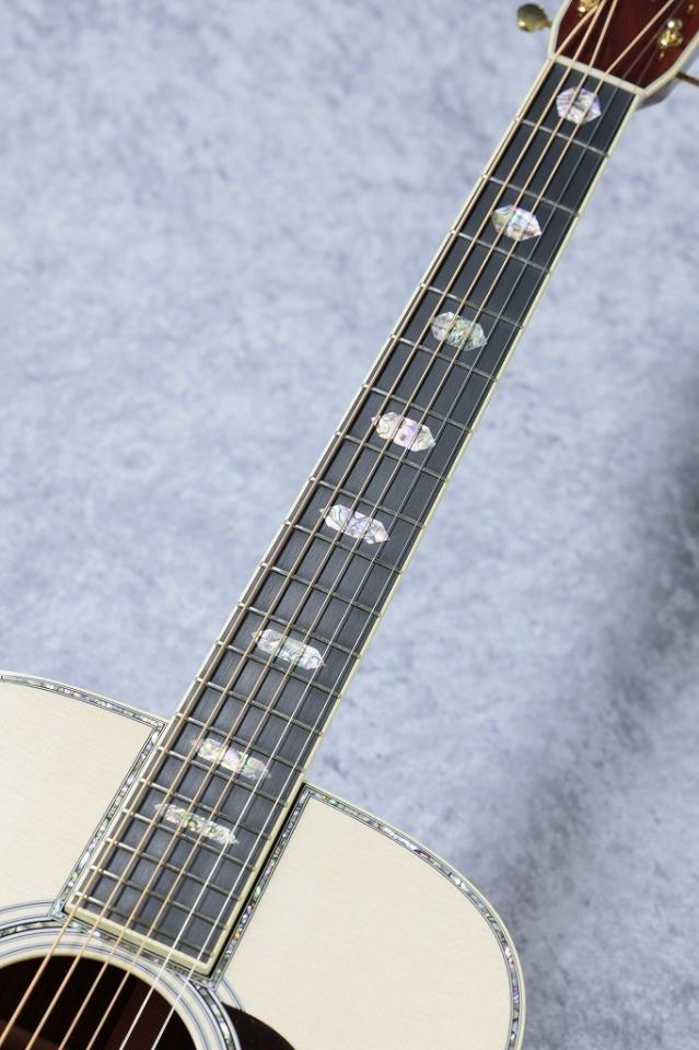 木材とネックシェイプに拘った当店オリジナルのカスタムオーダー品。トップ板の経年による色味の変化を楽しめるクリアフィニッシュのトップに、最高グレードの杢目が整った美しいイタリアンアルパインプルース。サイド・バックには同じくMartin社所有の最高グレードのホンジュラスローズウッド。目が細かく鮮やかで木材の生命力すら感じてしまう杢目は見ているだけでも楽しめてしまう美しさ。特にこの個体はうねりのある美しい板目のホンジュラスローズウッドを使用しており明るくも重厚な粘りのあるサウンドに繋がっています。最高グレードの木材と煌びやかなアバロンインレイの響きを最大限まで活かすために極薄ラッカーの”シンフィニッシュ”を採用。新品なが膜のとれた鮮明なサウンドも魅力です。ナット幅は42.9mm幅、ネックシェイプは。握り込みのしやすいスリムなかまぼこ柄のLowProfileシェイプ。ハイポジションが従来より細めの幅でネック全体の演奏性を高めたハイパフォーマンステーパーも採用。さらにボディの響きの個性を左右するブレーシングにはサウンドホール寄りのフォワードシフト、そして薄く加工されたスキャロップドブレイジング。こちらもヨーロピアンスプルースを使用。さらにすべての工程を手作業かつ滑らかに加工を施したGolden Era スタイルのブレーシングを採用。手作業で丁寧に削りこみ、磨き上げることですることでレスポンスと立ち上がりに優れた響きになっています。