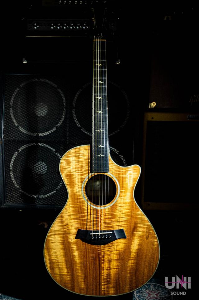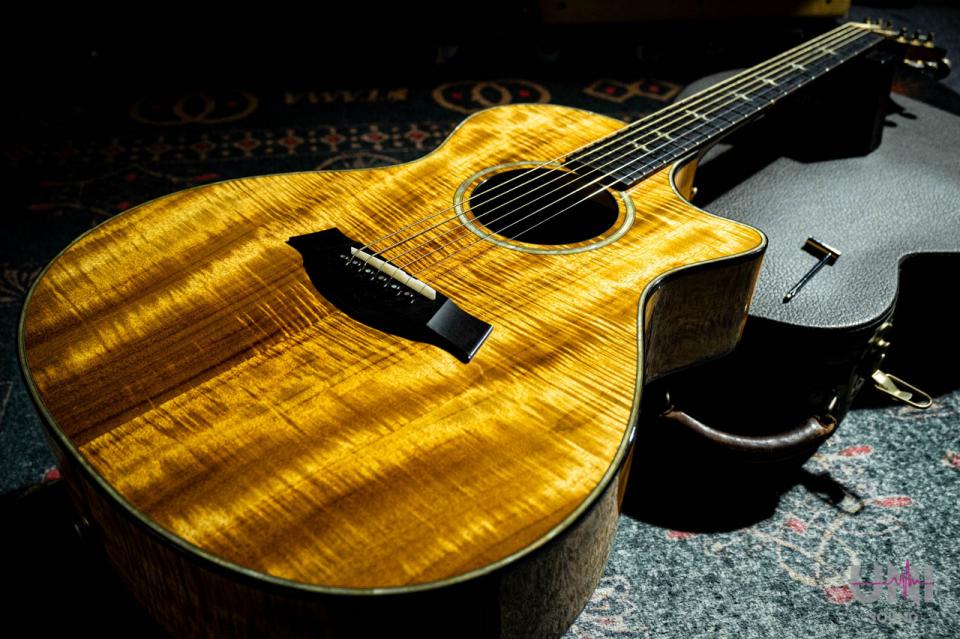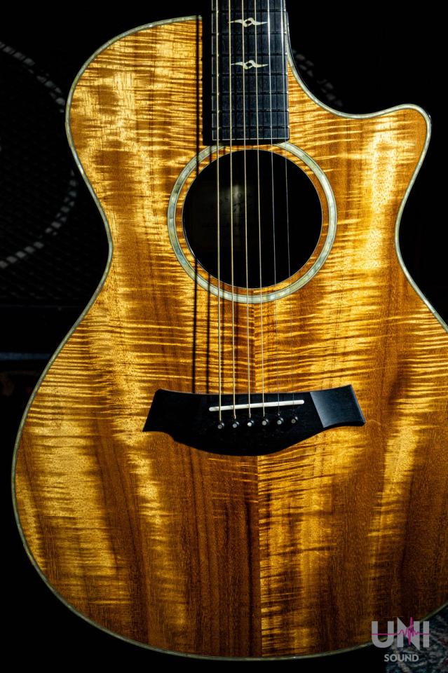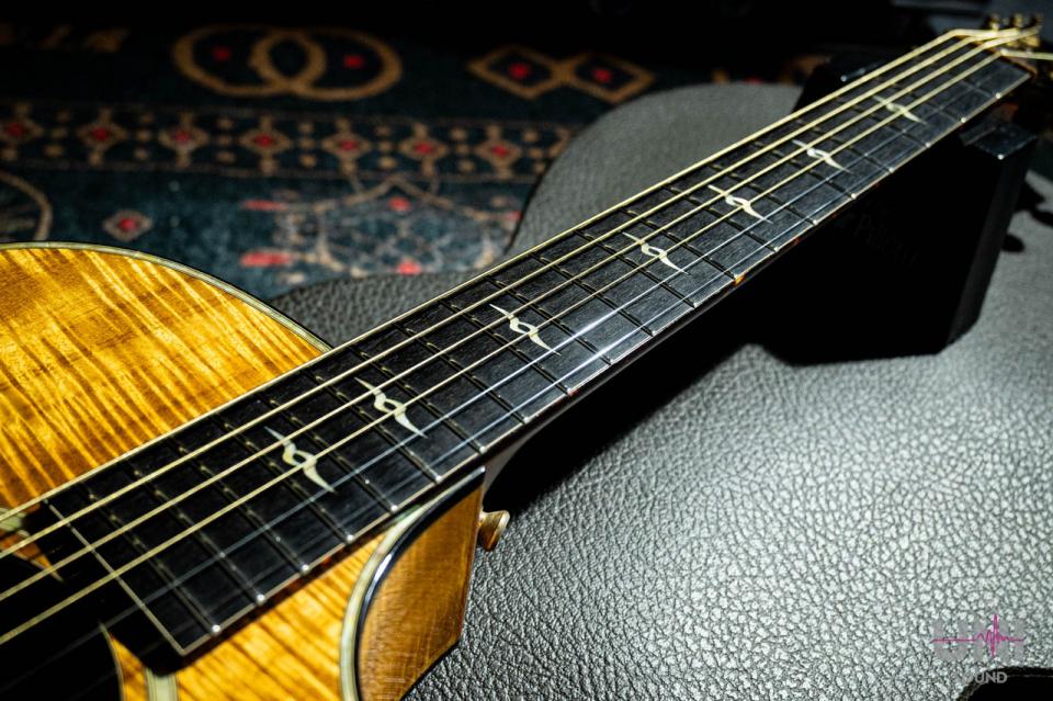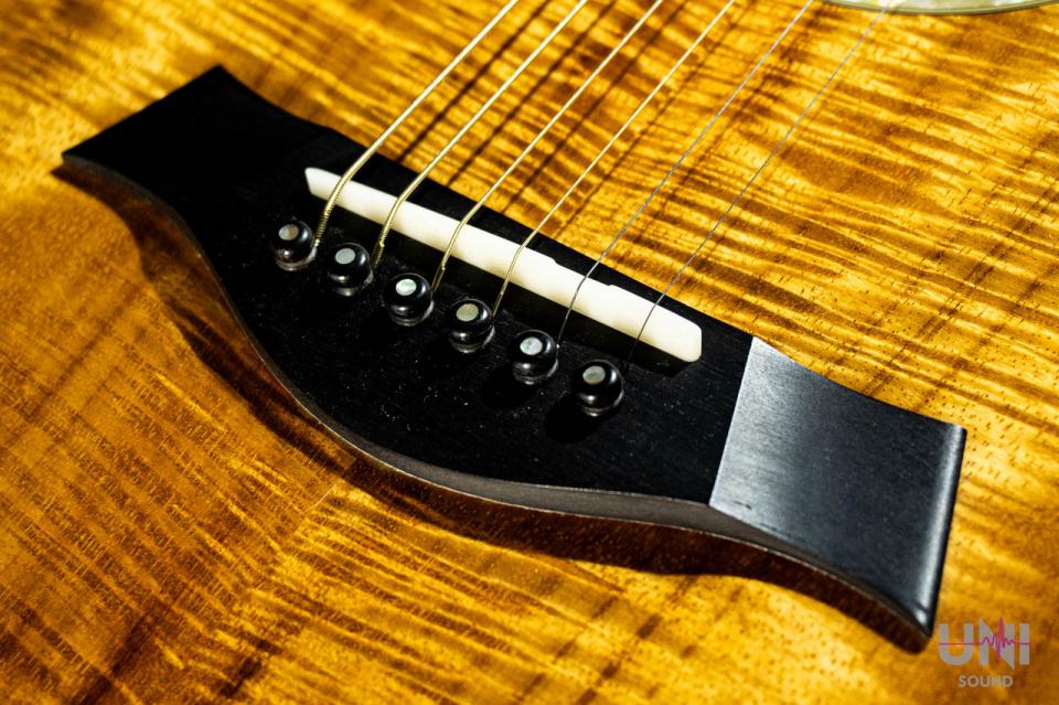 美しく全体に杢の浮き出た豪華なルックス、どこをとってもハイランクです。コア材らしいふくよかでやわらかい中低域、粒立ちの良い高域、極上のテイラーサウンドをお楽しみいただける一本です。