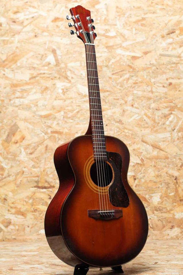 Paul Simon (ポール・サイモン)やJohn Denver (ジョン・デンバー)、Nick Drake (ニック・ドレイク)等、数多のフォークシンガー達が愛したGuild (ギルド)。現在もコアなファンからの支持が手厚い事で知られ、愛好家の間で密かに人気のある玄人好みなギターブランドです。本器は”F-30"1975年製の1本。独特なボディシェイプをもったギルドの人気モデルで1954年から1984年まで製造されていました。スプルーストップ、マホガニーサイド&バック、マホガニーネック、ハカランダ指板&ブリッジ、ノンスキャロップブレイシング、ライン入りトラスロッドカバー。この時期らしくレスポンスの良い軽快なサウンド。ふくよかでカラッとした出音が開放的に響いてくれます。太めの音色を持ち、ピッキングのタッチ次第では甘いサウンドからはきはきとした明瞭なサウンドまで対応できるポテンシャルを持つ1本です。経年相応の傷や使用感ある他、広範囲にわたって塗装にケースと反応したような跡がありますが、現状ベタつきなどはございません。ピックガードの縮みによりサウンドホール周辺にやや変形がみられますが、割れなどの大きなダメージはなく、ネックコンディションも良好です。使用感多めのため、お買い得なプライスでの出品です。ぜひご検討くださいませ。汎用ハードケース付属。