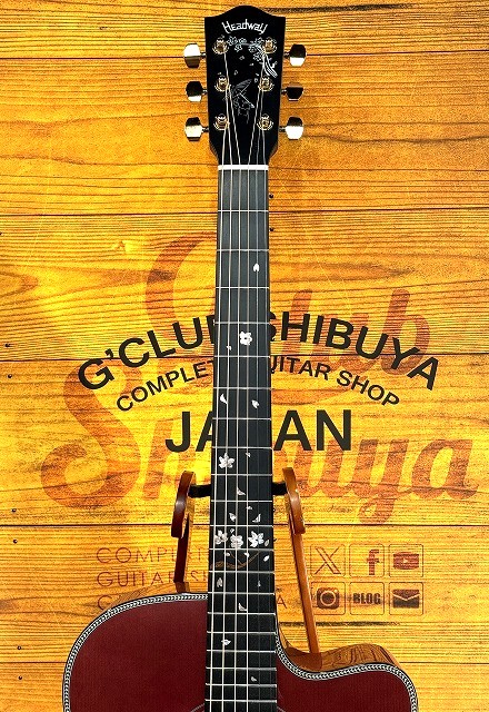 指板には貝や木材を駆使して表現された桜の木のインレイをデザイン。