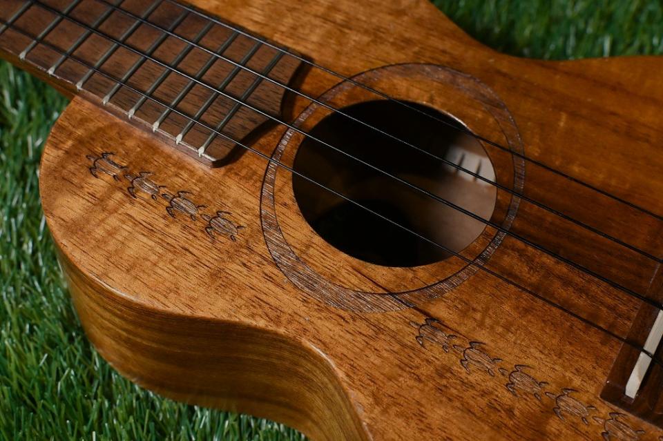 ボディトップの4弦側にレーザー彫刻にて施されたホヌのデザインが目を引く一本です。