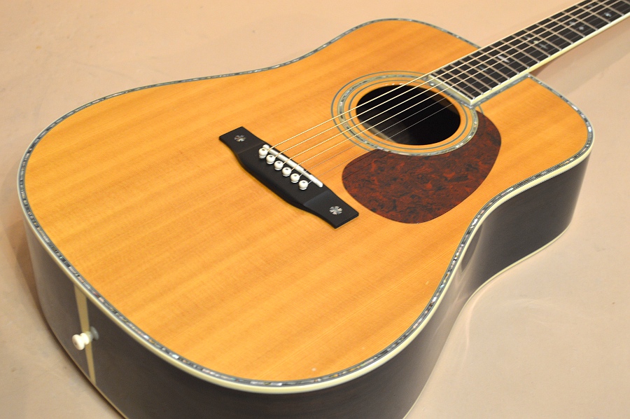 サウンドはオール単板だけあってガツンと力強く咆哮します!しっかりとしたローにパンチのあるミドル、煌びやかなハイなどが混然一体となり、パワフルで煌びやかなサウンドを響かせます。正直貝巻きモデルの煌びやかな倍音感よりは28寄りの直進性に富んだパワフルなサウンドのイメージです。フラットピックで掻き鳴らせば、力強くも煌びやかなパワフル・サウンドを響かせます。フィンガーで爪弾けば、スキャロップ・ブレーシングが効いてきて、煌びやかながら奥行きのある美しいサウンドを奏でますので、あらゆるジャンルやプレイ・スタイルOKのオールマイティーなサウンドをお楽しみ頂けます!