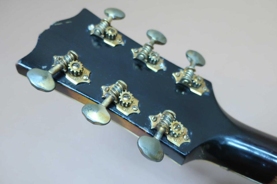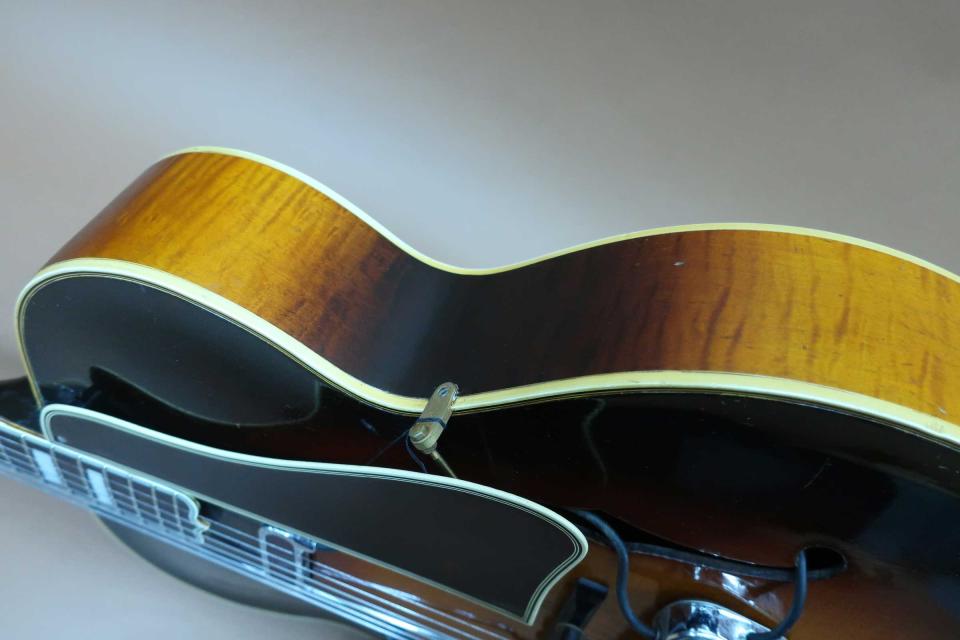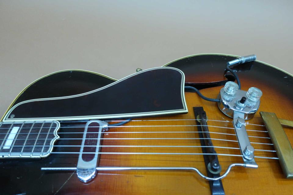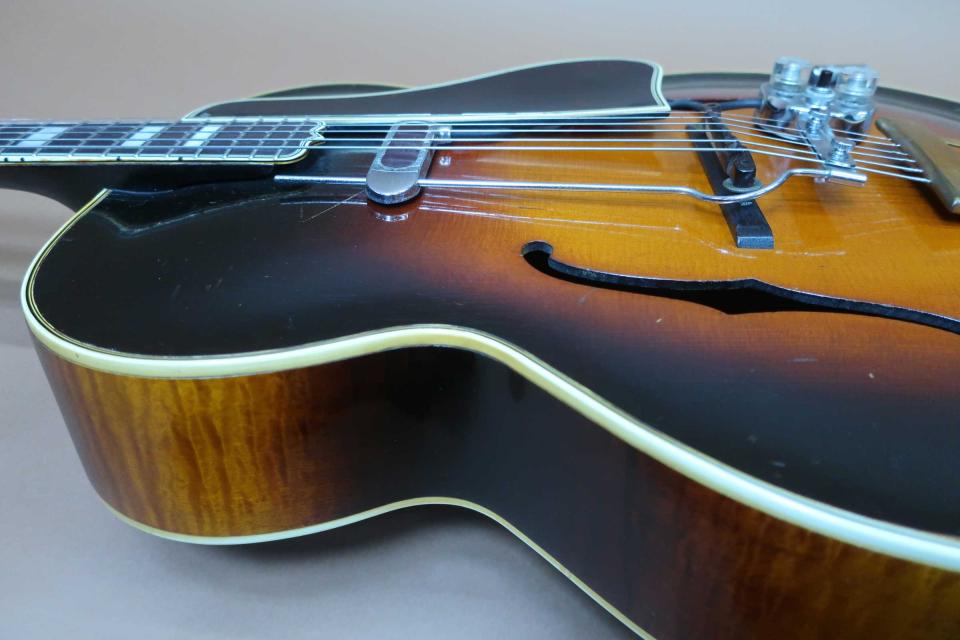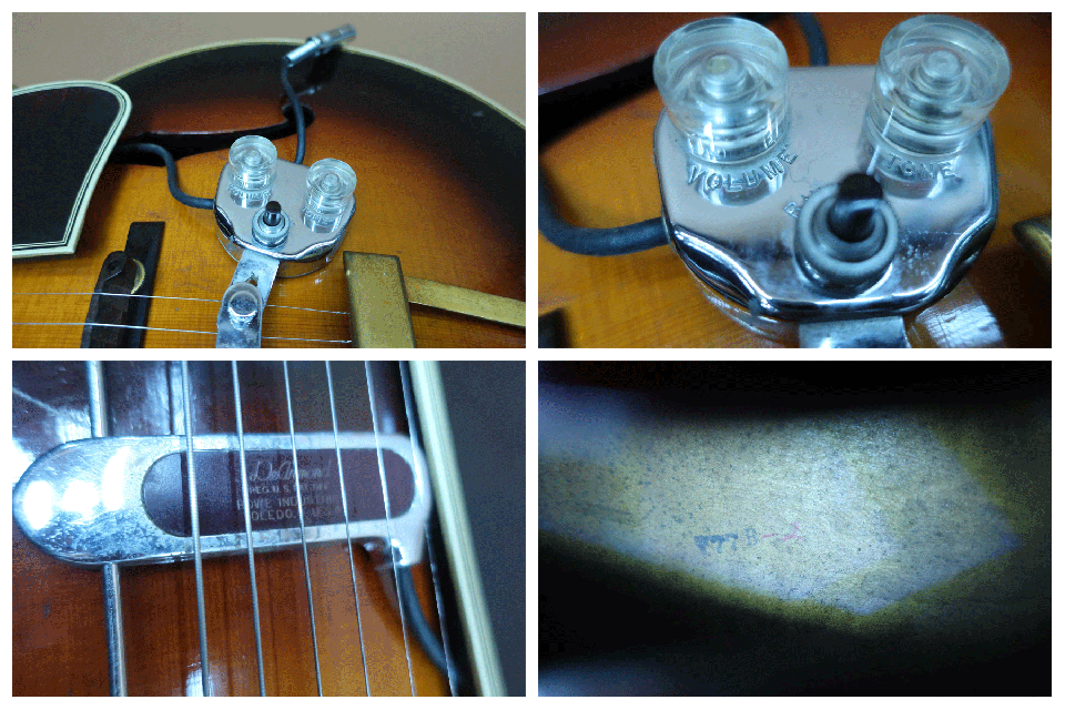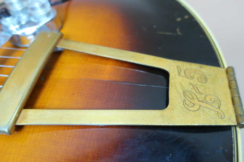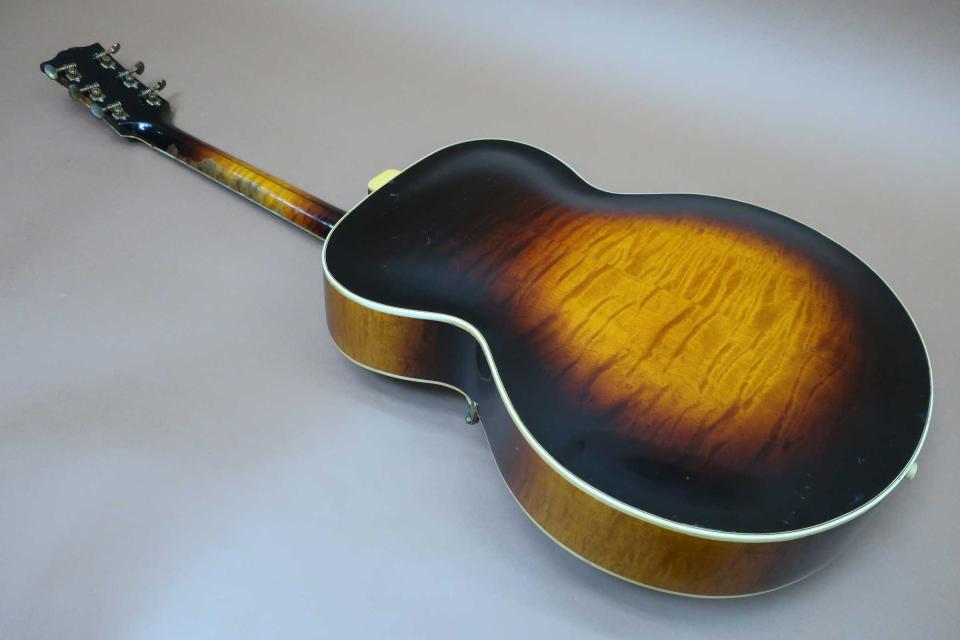 状態はペグのメッキの曇りとトルクムラは有りますが機能的には問題は無いと思います。フレットも交換済みで指板修正もされておりプレヤビリティも良好です。トップは薄くラッカーチェッキングと細かな打痕やきずは有りますが年代から考えれば綺麗なコンディションを保っており、入荷時にピックガード上部にヘアーラインクラックが表面的に有りましたので修理工房でリペア済みです。サイドも小さな打痕と擦り傷程度で目立つダメージはありません。バックもボディ周りに小さな打痕や擦り傷は見られますが酷く目立つダメージは見受けられません。ハカランダ・ブリッジやサドルもオリジナルでテイルピースも金属メッキの曇りは有りますがオリジナルです。ピックアップの電気系統は入荷時にリペア工房にて調整済みです。弦長約628mm、ナット幅約42mm、弦高は12F6限約2mm、1弦約1.5mmで、サドルの弦高調整の余裕もありネックの反りや元起も見受けられずネックを含めプレヤビリティも良好です。オリジナルと思われるハードケースも付属しております。本器はコレクター様からのお預かり委託ギターで現状販売になります。中古市場でも滅多に出ないコレクタブルな逸品で、1930年代のヴィンテージギターは世界的にも驚くほど価格が高騰していますが、価格を抑えた設定にさせて頂きました。是非この機会にご検討を頂ければ幸いです。