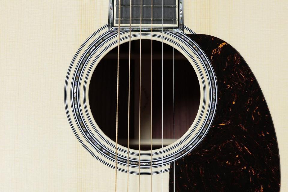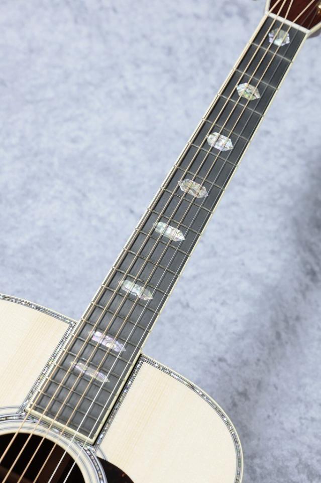 最高グレードの木材と煌びやかなアバロンインレイの響きを最大限まで活かすために極薄ラッカーの”シンフィニッシュ”を採用。新品なが膜のとれた鮮明なサウンドも魅力です。ナット幅は42.9mm幅、ネックシェイプは。握り込みのしやすいスリムなかまぼこ柄のLowProfileシェイプ。ハイポジションが従来より細めの幅でネック全体の演奏性を高めたハイパフォーマンステーパーも採用。さらにボディの響きの個性を左右するブレーシングにはサウンドホール寄りのフォワードシフト、そして薄く加工されたスキャロップドブレイジング。こちらもアディロンダックスプルースを使用。さらにすべての工程を手作業かつ滑らかに加工を施したGolden Era スタイルのブレーシングを採用。手作業で丁寧に削りこみ、磨き上げることですることでレスポンスと立ち上がりに優れた響きになっています。