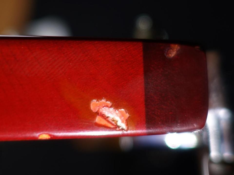 ヘッド下部にギターハンガーの使用に伴うと考えられる塗装の反応や、宿命的なバインディングのクラックなどが全体的に見受けられます。