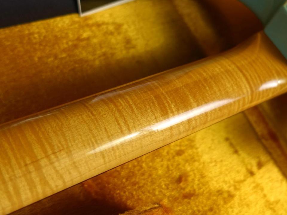 アルダーボディにスラブ貼りのローズウッド指板、杢目の美しいAAグレードのフレイムメイプルネックというウッドマテリアルに、ボディカラーは人気の高い“Daphne Blue”。