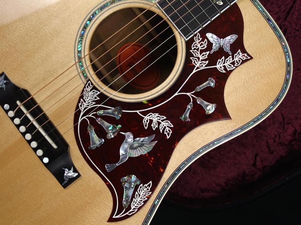 さらにヘッドから指板、ピックガード、ブリッジにかけて、パールやアバロンで象られた合計13羽のハチドリが装飾されています。