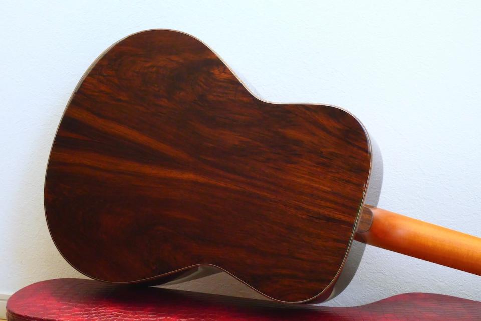 工房に長年寝かせてあったジャーマンスプルーストップに、稀少なマダガスカルローズウッドを採用しました。