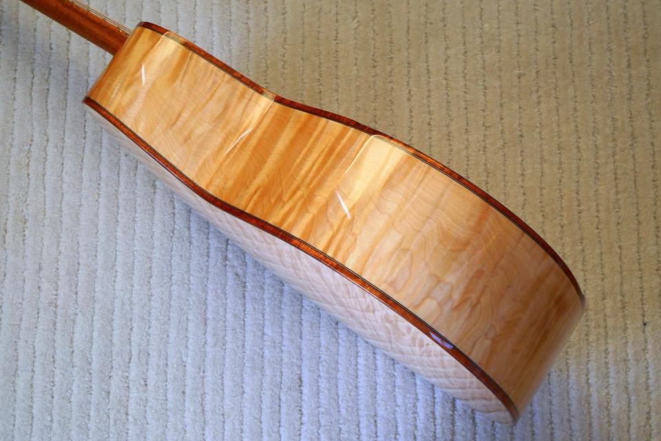 工房に長年寝かせてあった、極上のジャーマンスプルース(ベアクロウ)トップに、稀少なワイドフレイムの杢が入ったとち材をバック&サイドに採用しました。
