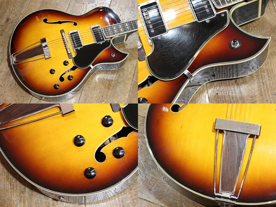 ◆1960年代後半~1970年代の製造。ヤマハのフルアコです。独創性のあるデザインやパーツが、今改めて見てみるととても新鮮に感じます。メイプルボディ、トップにはスプルースを採用し繊細ながらダイナミックなレスポンスを得ています。オリジナルピックアップは低出力で弦振動を生々しくアウトプットします。本機は黒いプラスチックカバーですが、年度によってはニッケルカバーもある模様。詳細は不明です。このあたりの年代のヤマハと同じくゼロフレットが打たれている点や、樹脂サドルの採用という点もなかなか。