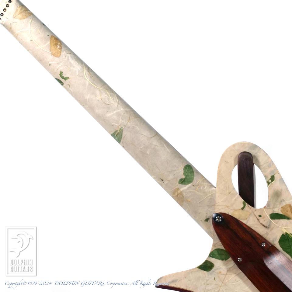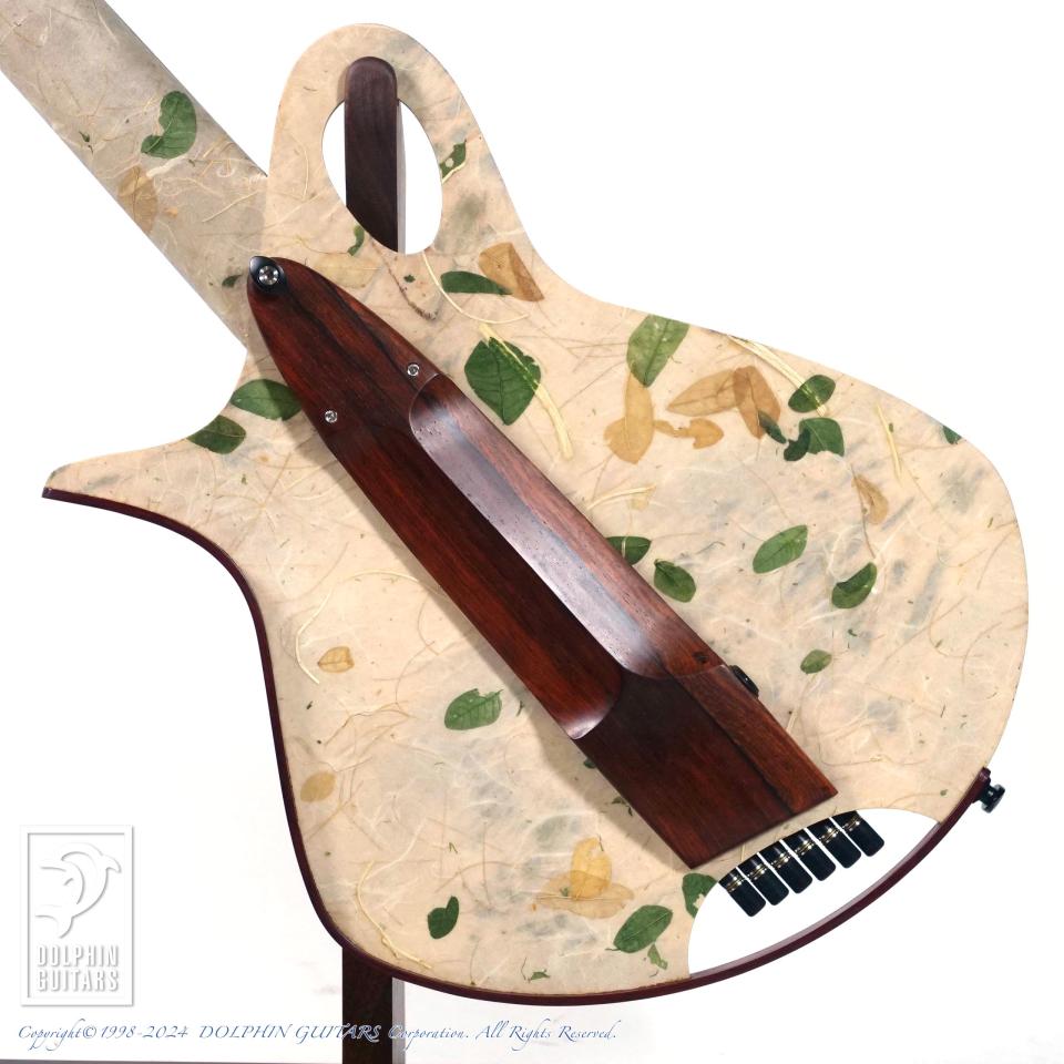 ベンドしたココボロ材で縁取られたニーレスト、同じくココボロ材で高度に様式化された構造梁でボディを支えます。そしてボディとネックは、ラミクロス(天然繊維の中で最も強靭な繊維)、金糸とレインツリーの葉を織り込んだ、桑の樹皮紙を2枚重ねにすることで、剛性と弾力性を持たせています。確かな強度を確保しつつ、約1.39kgの驚異的な軽さとなっております。