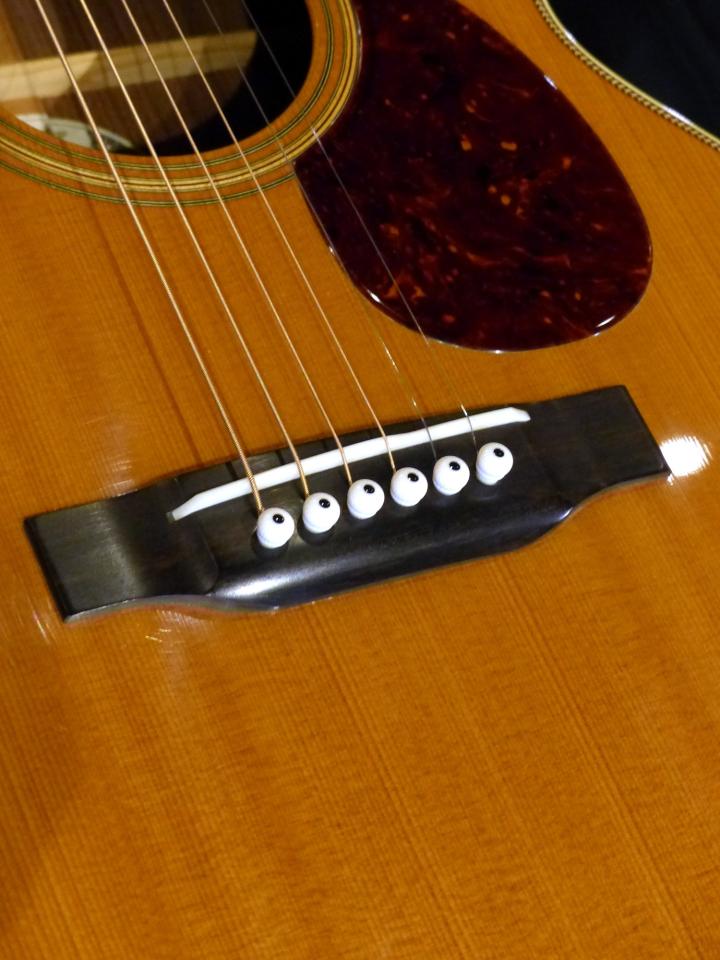 外観はよく見れば指板エンドとサウンドホール・ロゼッタの狭間にクリア塗装のヤレがみられますが、