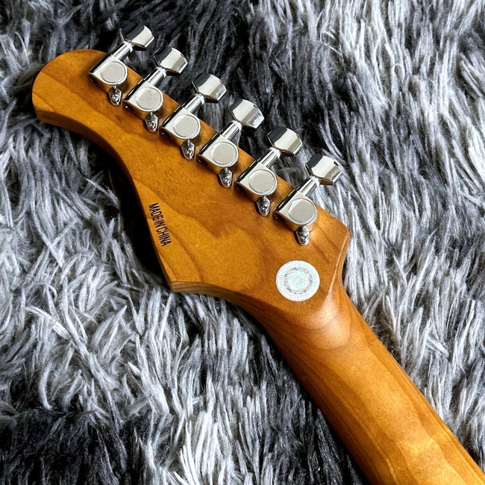 ローステッドメイプルとはメイプルを高温で加熱処理して材の中の水分や油分を揮発させることにより木材を経年変化した状態に人工的に近づけた材のことです。経年変化が進んだ材は歪みやねじれが生じにくくなります。ネックに使用されるとその効果は安定性だけでなくサウンドにも及び、豊かな生鳴りと経年変化したビンテージのようなこなれたトーンを生み出します。一般的に高級機種などで用いられる材ですが、手に取りやすい価格帯に落とし込むことに成功しました。