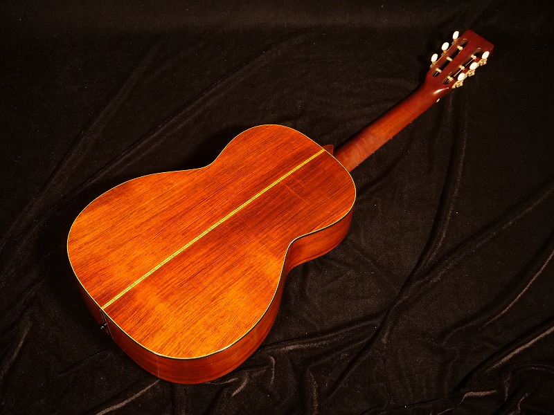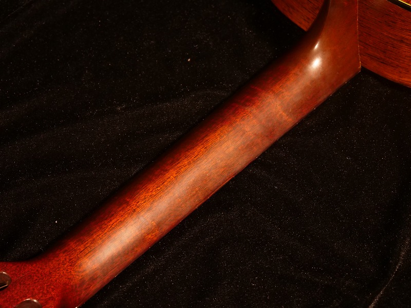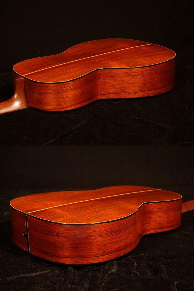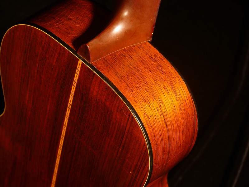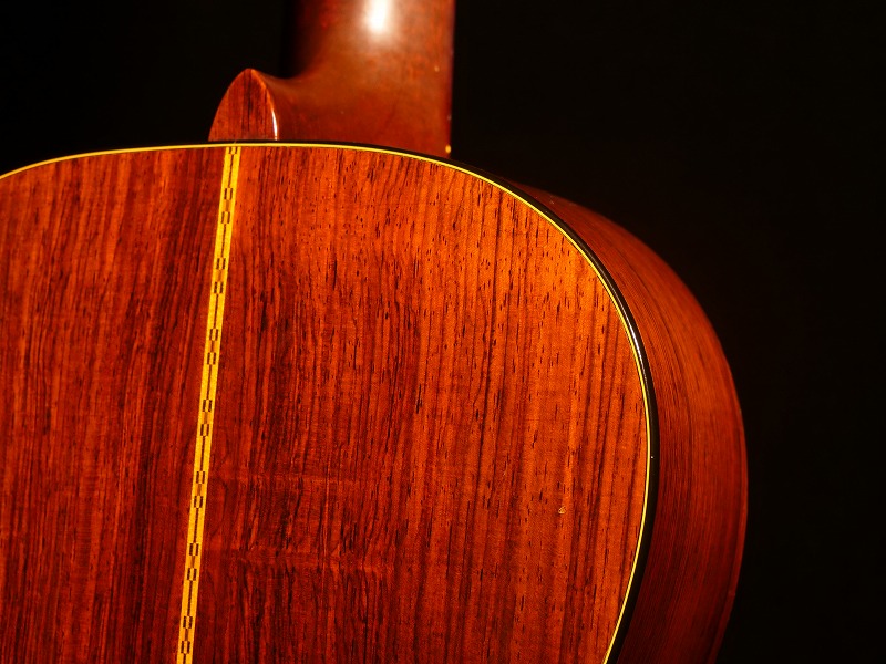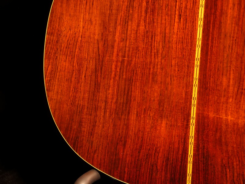 トップ材に杢目が細かい整ったスプルース単板、サイド・バックに大変貴重な柾目のハカランダ単板を使用、マホガニー1Pネック、Tバーロッド、ハカランダ指板/ブリッジ、鼈甲柄ピックガード、ノンスキャロップド・Xブレイシング、ハカランダ化粧板、3連白ボタンペグ。ナット幅は約47.5mmの幅広ですが、Tバーロッド故、薄めのソフトVシェイプですので意外と慣れれば弾きやすいです。