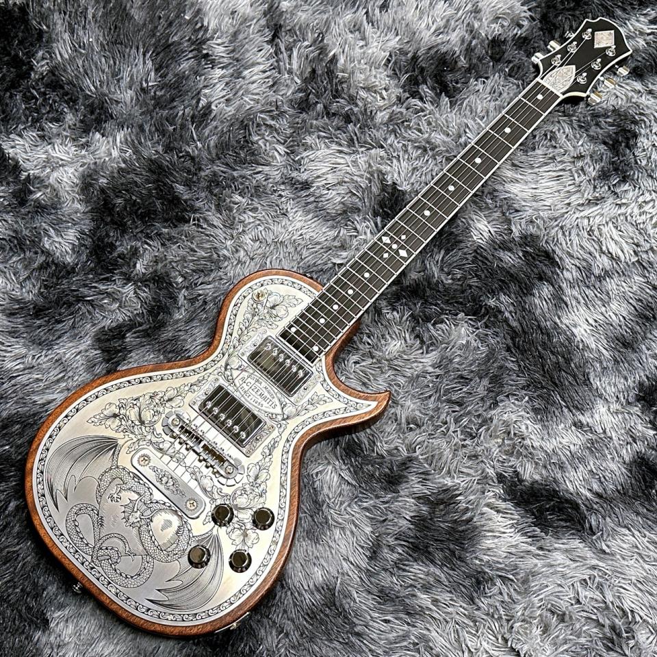 彫金装飾を用いたメタル・フロント・モデル。「ドラゴン」と「ハート」という別々のモチーフを昔の映画のタイトルからヒントを得て、組み合わせて生まれたデザイン「Dragon & Heart」の24フレット仕・・・