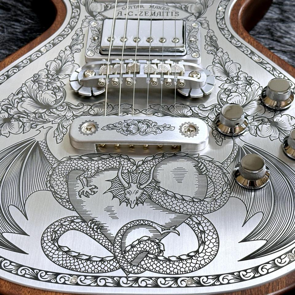 ゼマイティス・オリジナルのアルミ合金を使用したブリッジ&テイルピースを搭載し、ゼマイティス独自のトーンを生み出す要素となっています。同様にアルミ合金を用いたヘッドのダイアモンド・エンブレム、トラスロッド・カバー、テイルピースやピックアップ・リングをはじめ、アウトプット・ジャック・プレート、コントロール&スイッチ・バック・プレートに至るまで装飾を施しています。