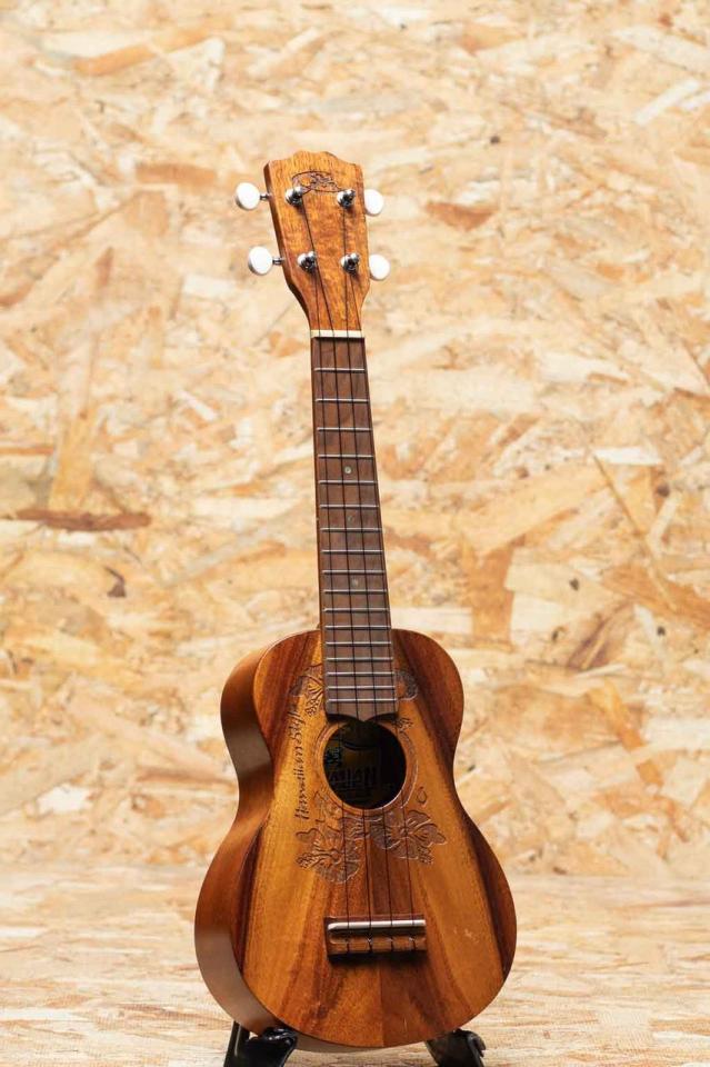 ハワイ製ウクレレブランドして人気を博した"G-String"。ハイビスカスデザインのレーザー彫刻が施されたハワイアンスタイル、ソプラノモデルUSED品。