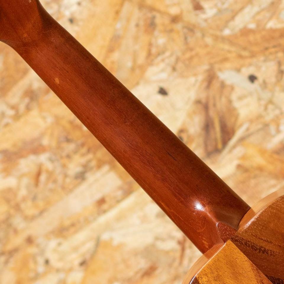 1993年に設立、現在ハワイ島にてデレクシミズにより製作されているG-stringウクレレ。アーティストからの支持の高さなどからどんどん人気を呼び、ハワイアンウクレレの代表的なブランドどとしてプロを始め幅広い方々に愛用されています。本器はハイビスカスデザインのレーザー加工が施されたソプラノモデルのUSED品。ハワイアンコアボディ、マホガニーネック、ローズウッド指板&ブリッジ、グローバーペグ、アバロン指板ドットインレイ。当時はオワフの工房でチームで製造されており、手の届きやすい価格帯にて幅広く展開。たちまち人気を集め、ハワイアン3大ブランドの一つとまで称されていました。ハワイアンコアらしい甘みたっぷりのサウンドで、素朴さと愛らしさも感じるハワイメイドならではの味わい。部分的な傷や少しトップの沈みなどは見られますが使用上は問題のない状態です。ハイビスカスデザインがおしゃれでルックスも良い1本です。チップボードケースが付属します。
