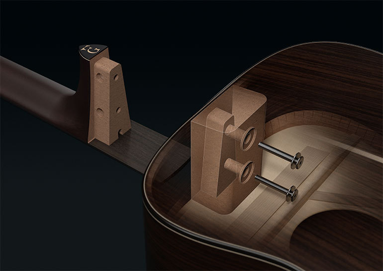 ネックはボルトオン部分と接着部分を組み合わせた新しい構造デザインにより、ボディの振動を高めると共にメンテナンス性を向上させました。ネックとボディのジョイントは高精度に仕上げ、調整しています。