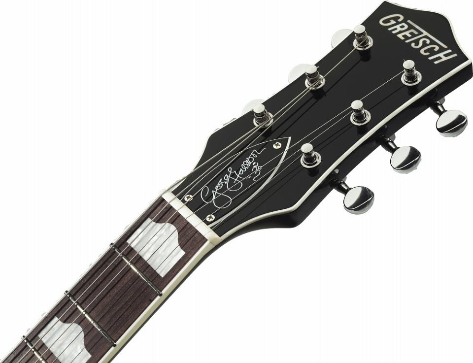 このGH6128T-GHは、1960年代初頭にハリソンが中古で購入した、オリジナルのグレッチDuo Jet(1957年製)に見られる特徴的な装飾と仕様を再現しています。