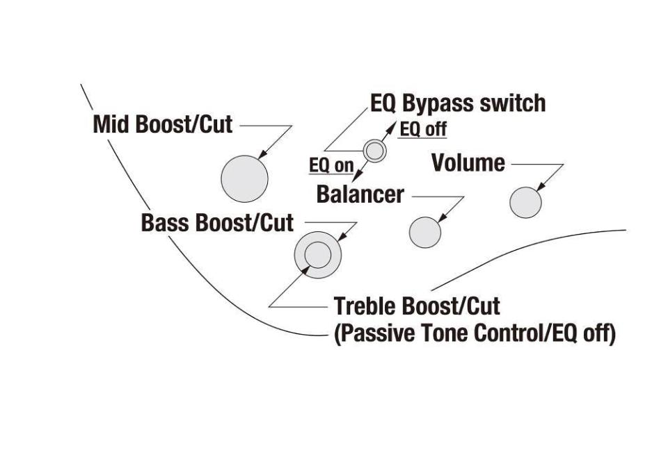 High/Mid/Low 3バンドのイコライジングが可能なアクティブEQです。パッシブ・モード時はHighノブがトーン・コントロールとして機能します。