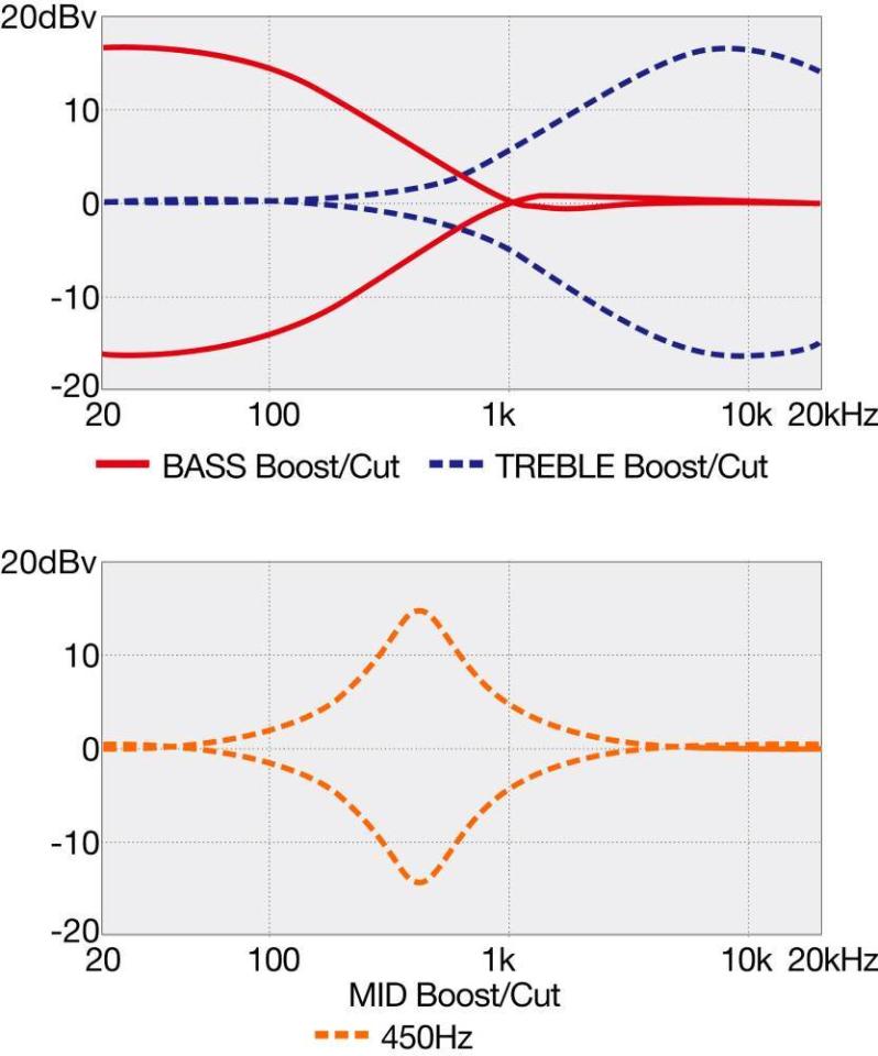 High/Mid/Low 3バンドのイコライジングが可能なアクティブEQです。パッシブ・モード時はHighノブがトーン・コントロールとして機能します。