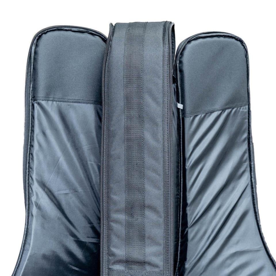 内部はマジックテープ式の仕切り構造を採用しており、仕切りを外すことで胴厚のあるギターの収納にも対応。