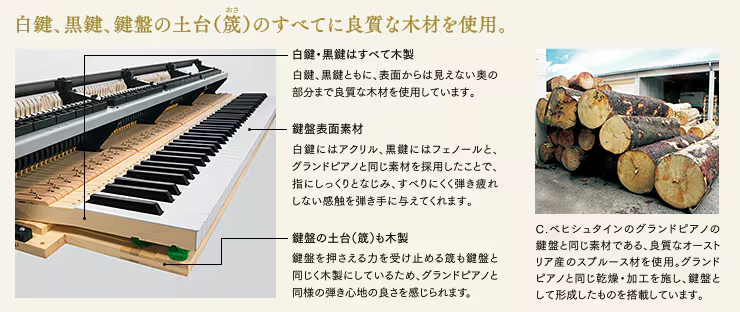 CELVIANO Grand Hybridが採用した3つのピアノは、音色や響き、そして鍵盤を弾いた時の音の返りにもそれぞれ異なる特徴があります。