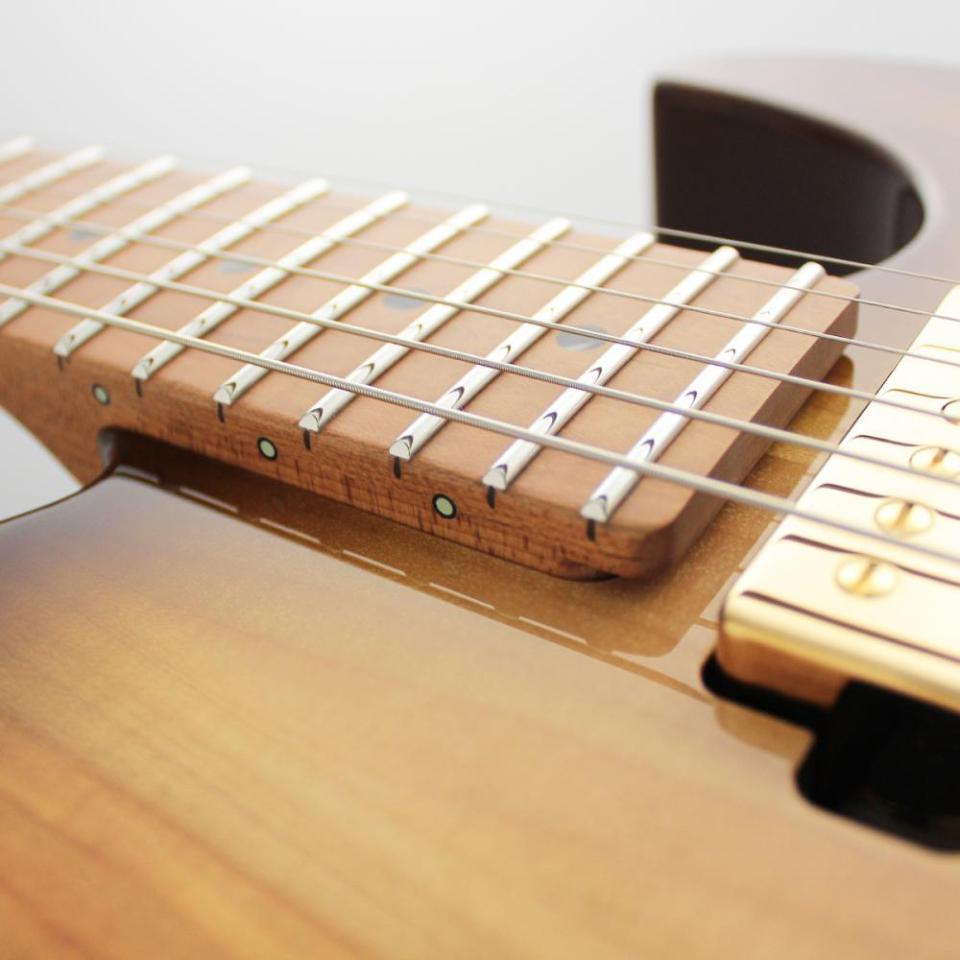 当モデルに合わせて調色されたほうじ茶バーストカラーは、個性的な木目のスポルテッドメイプル材を、より高貴な外観へと昇華しています。
