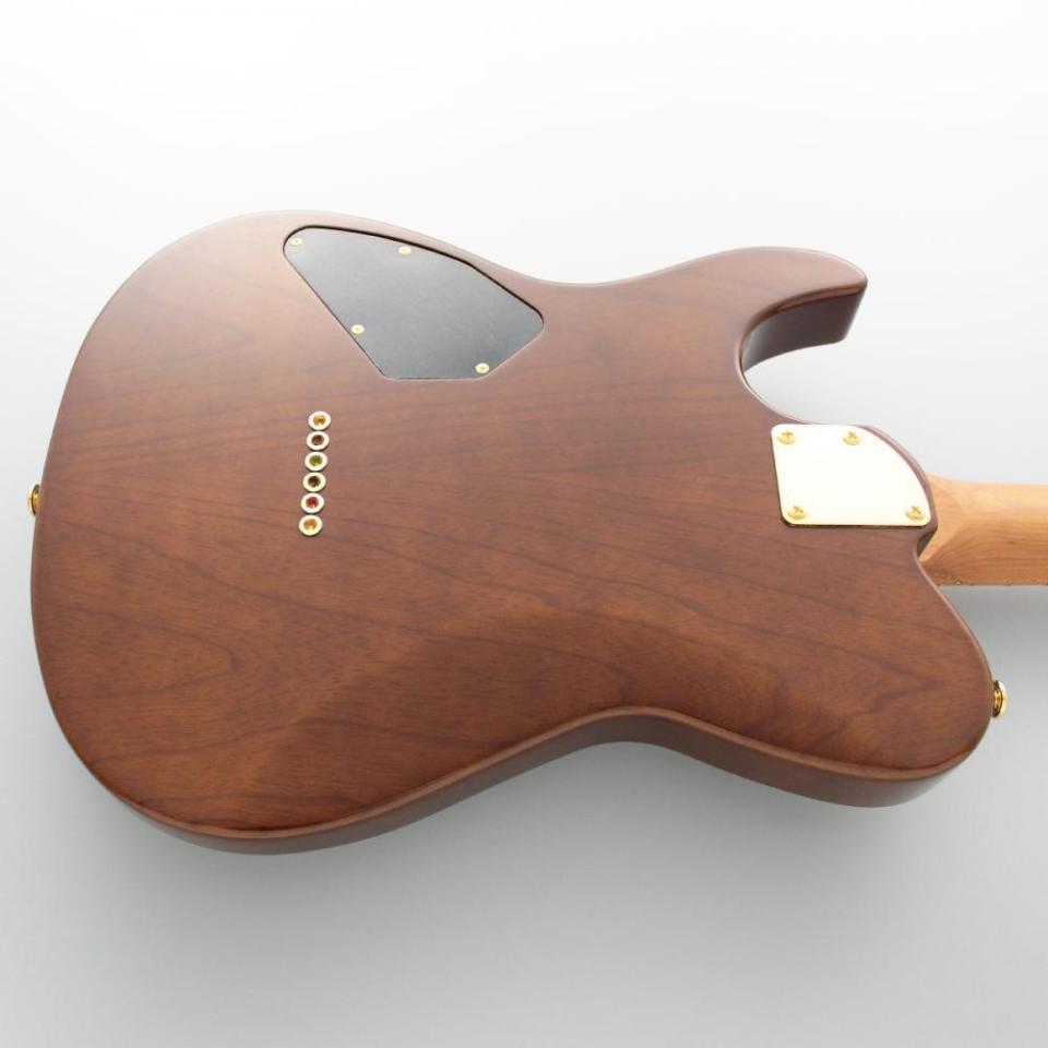 当モデルは、スポルテッドメイプルトップ・アッシュバックボディ、ローステッドメイプル指板、ほうじ茶バーストカラーという組み合わせ。初のローステッドメイプルネック採用となります。