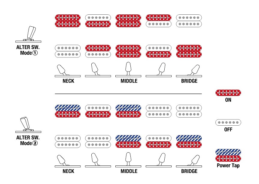ミニ・スイッチの切り替えひとつで、自由自在にハムバッカー・モードとシングルコイル・モードを切り替えられ、10パターンのサウンド・バリエーションを奏でられます。