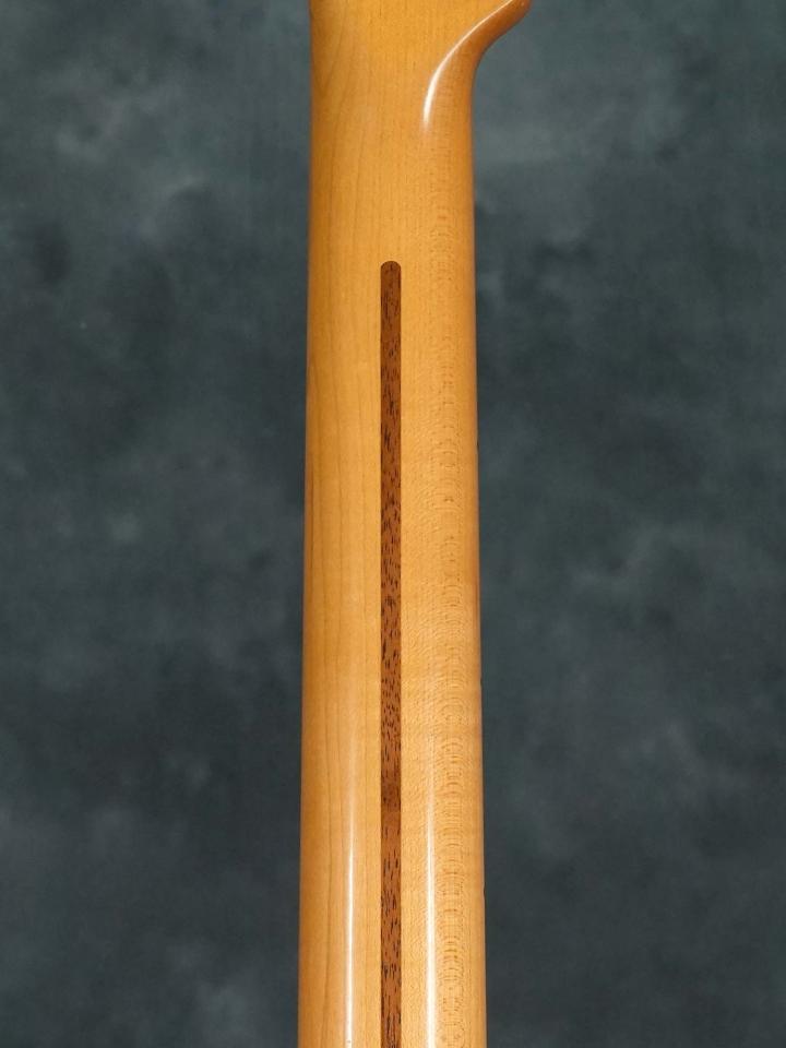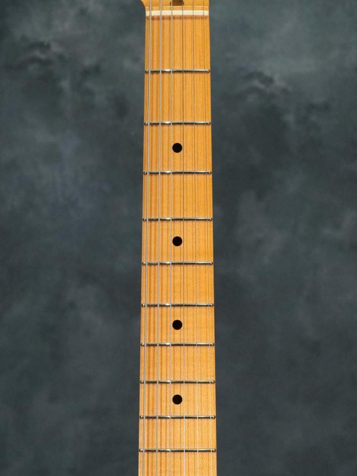 センターからズレた位置で接着された”オフセンター”の軽量な2-Pieceアッシュボディに、適度に厚みの有る52 Style Uシェイプの1-Pieceメイプルネック、ヴィンテージと同じ7.25インチの指板ラディアスに、オリジナルよりも僅かにサイズアップしたJescar 45085フレット、ピックアップはフロント&リア共にホセフィーナカンポス女史のハンドワウンドによる50-51 Blackguardを搭載し、3-Wayセレクタースイッチにハイパスコンデンサの付いたマスターヴォリューム+マスタートーンのコントロール、オクターブチューニングが合うようにスラントしたブラス製サドル。