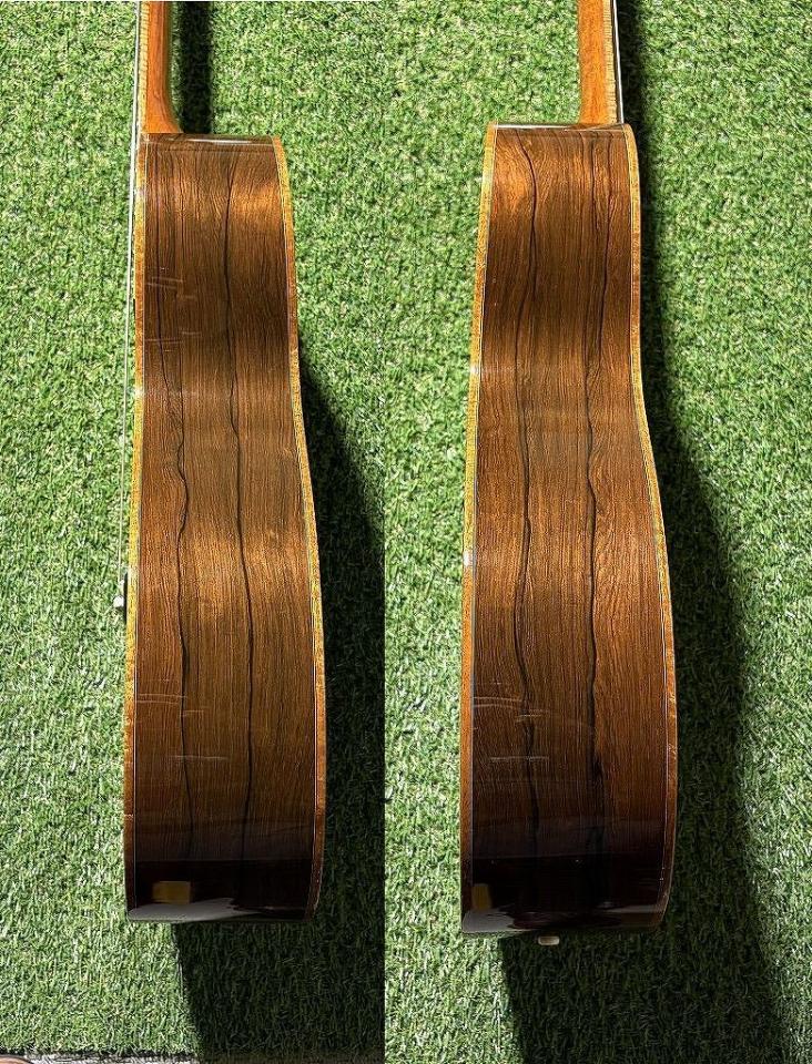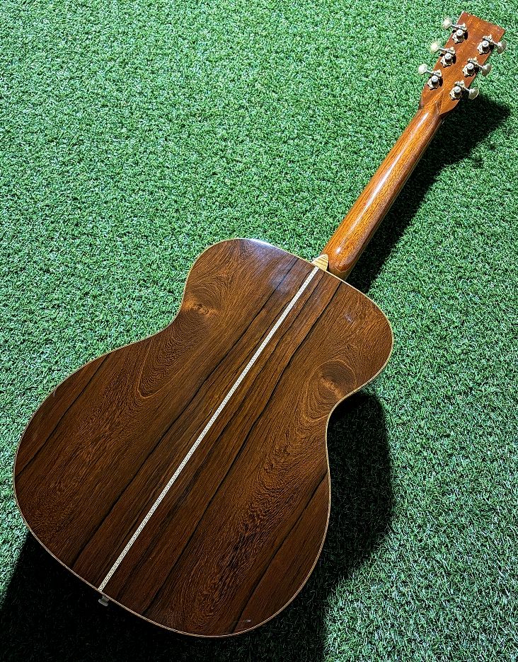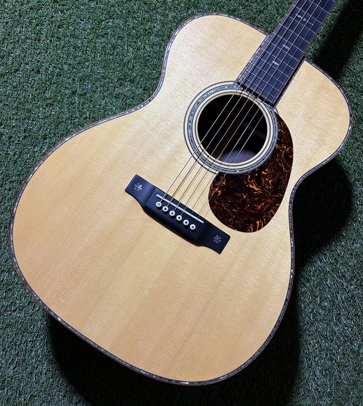 レギュラーラインナップの000-42と比較しても箱鳴りの深さが別格でボディ全体が響くかの様な奥行きのある鳴りが堪能でき、倍音豊かな余韻はいつまでも爪弾いていたい気持ちにさせる1本です。