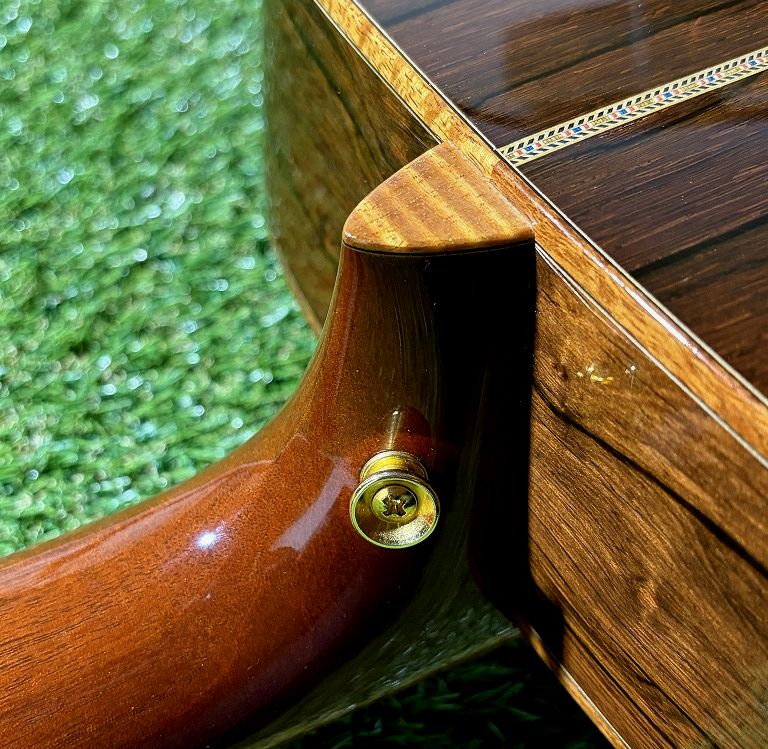 ボディを縁取るフィギュア―ドコアのバインディングも非常に陰影のある木目が存在感を放っており、各部を彩るアバロン・インレイとも相まって非常の高級感のある仕上がりとなっております。