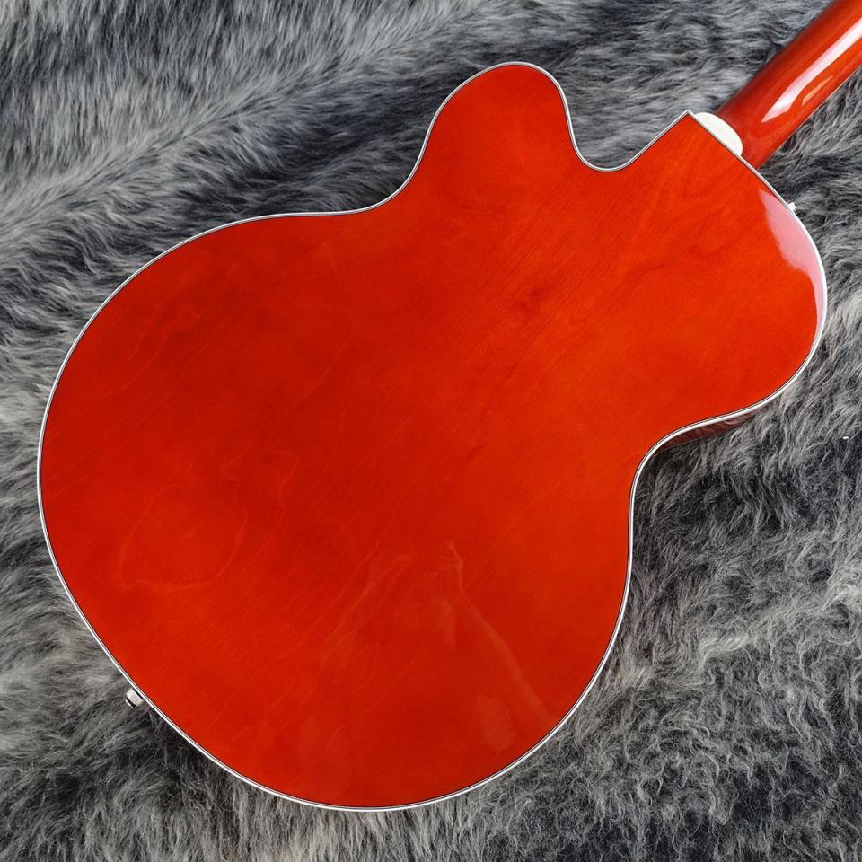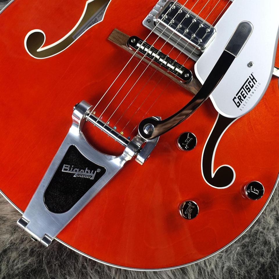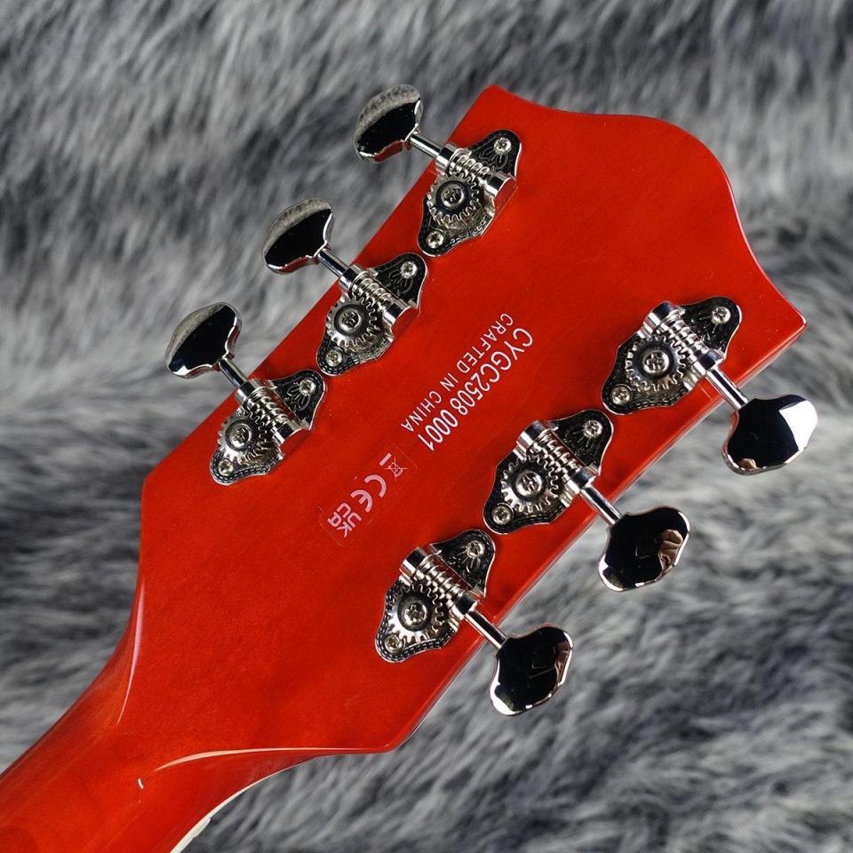 コントロール部には、トレブルブリード回路付きマスターボリューム、マスタートーン、各ピックアップのボリュームコントロール、3ポジションピックアップトグルスイッチなど、多彩なアップグレードをフィーチャーしています。その他、バインディングされたオーバーサイズFホール、マルチプライボディバインディング、小さめの50年代後期G6120バウンドヘッドストック、ヴィンテージスタイルのオープンバックチューニングマシン、Graph Tech NuBoneナット、パーロイドNeo-Classicサムネイルインレイ、固定式Adjusto-Maticブリッジ、BigsbyB60ヴィブラートテイルピースといった特徴を備えています。