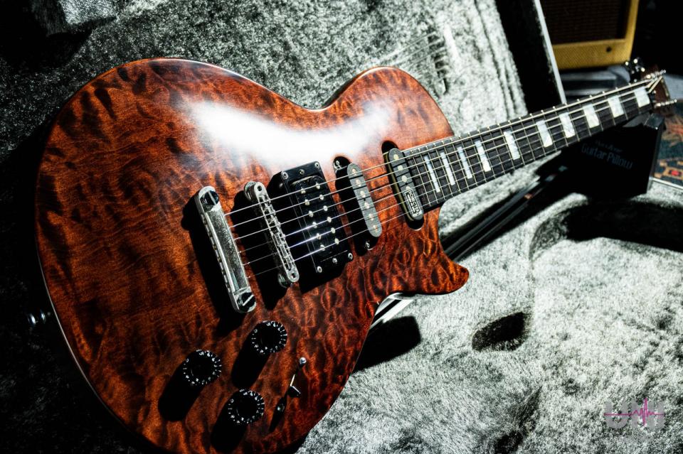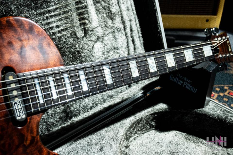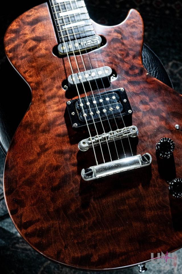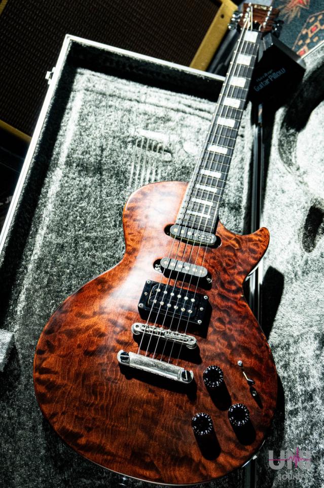 少し小振りなレスポールシェイプに杢目の美しいブラウンのキルトメイプルトップ、メイプルネックにエボニー指板を採用。ボディがサテンフィニッシュなのもポイントです。